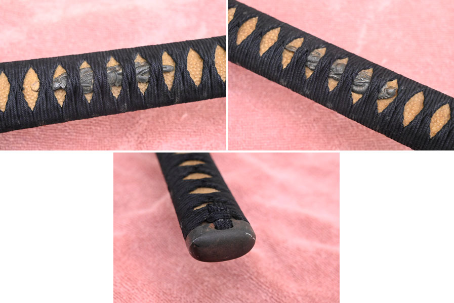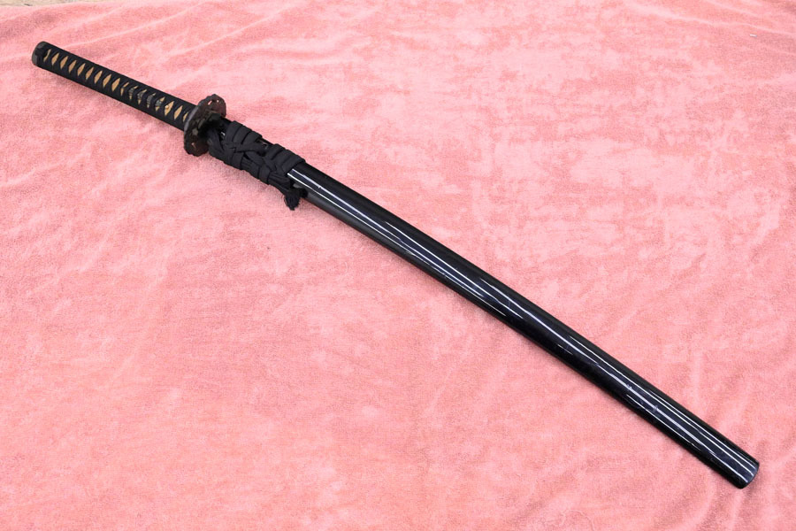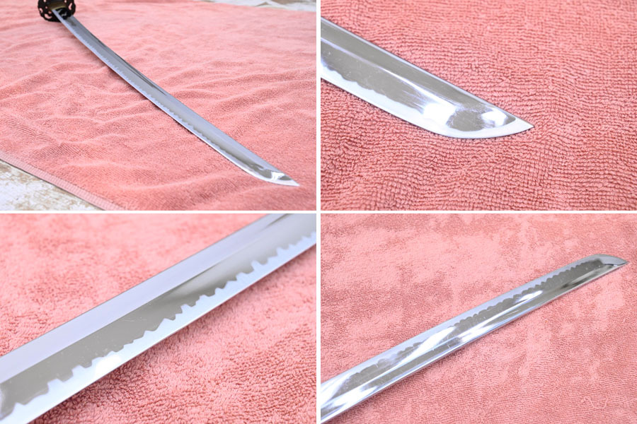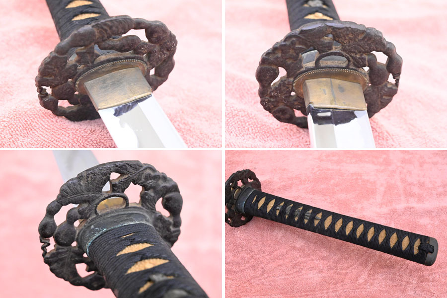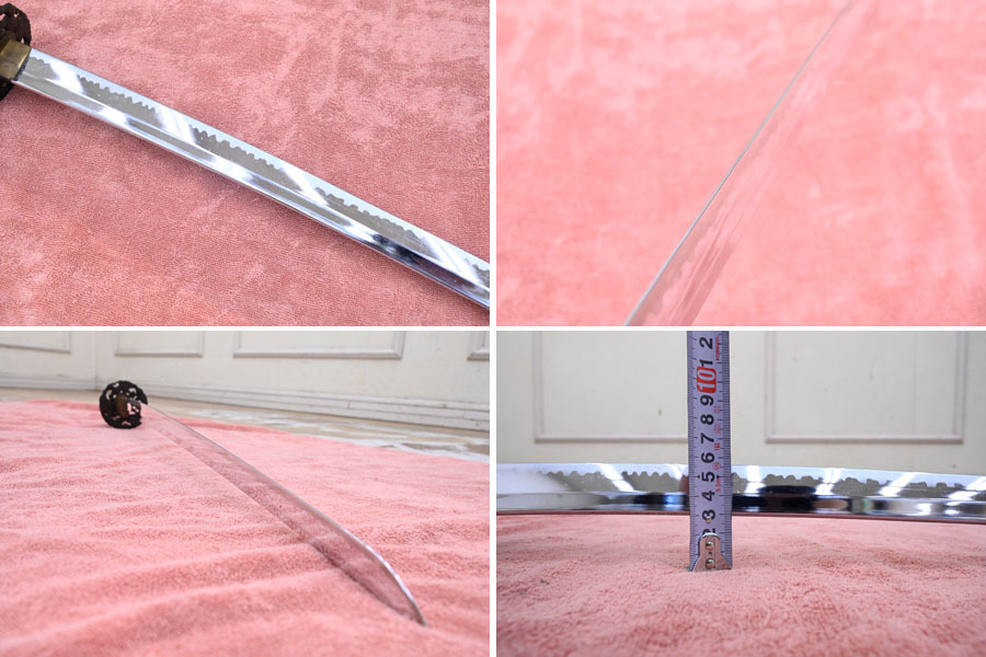 ----------------------------------------------------------------------------------------- ●送料や注意事項は必ずご確認下さい。落札後にトラブルになるケースが増えております。● ◆コンディションは写真・文章にて記載して有りますが、全てのキズの写真は掲載致しておりません。大きなダメージを除き見落とし、記載漏れが有る事はご了承下さい。 ◆当サイトにて出品する商品は多種多彩で、当方商品知識の無い物も多数ありますので落札後の質問やメンテナンス等にはお答えできません。 ◆入札された時点で、画像、文章をご理解していただいたものと判断させていただきます。不明な点は前もってQ&Aからお願い致します。入札後の質問やお電話等でのキャンセルは一切受け付け致しません。 ◆商品説明に「ノークレーム」と記載しているものに関しては、如何なる状況で届いても保証致しません。詳しくは注意事項の「商品到着後について」の最後に記載しておりますのでご確認下さい。 ---------------------------------------------------------------------------------------- 中古品ですのでキズ、ヨゴレ、スレ、サビ、鍔少し緩い等有りますが程度は良いでしょう。 全長 101.5cm 刃渡り 68cm | ||