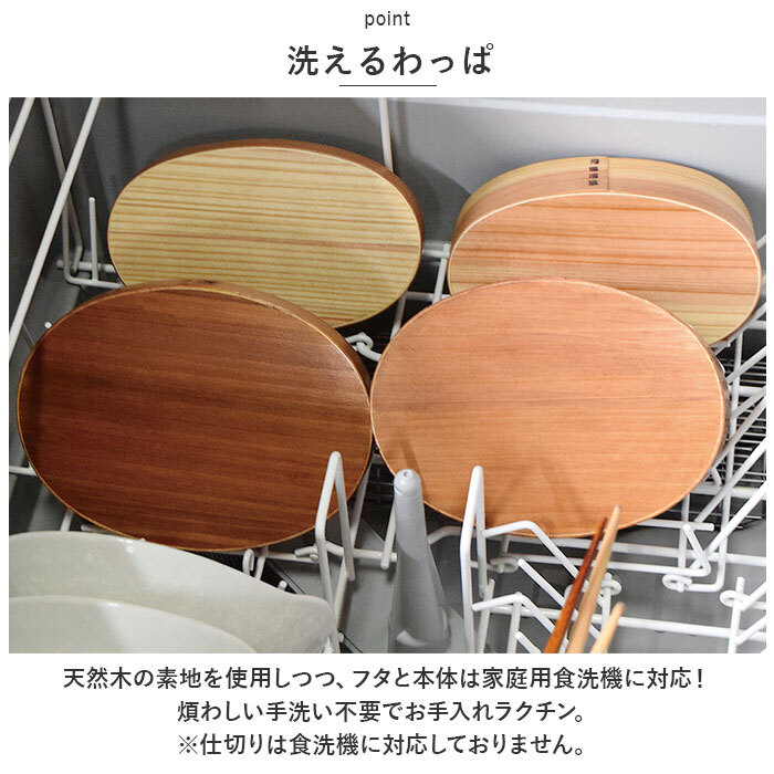| 商品説明 | ・・忙しい毎日の味方!日本製&食洗機対応の曲げわっぱ弁当箱(Sサイズ)が登場。 ・【洗えるわっぱ】 ・天然木の素地を使用しつつ、フタと本体は家庭用食洗機に対応!煩わしい手洗い不要でお手入れラクチン。(※仕切りは食洗機に対応しておりません。) ・【毎日使いに最適】 ・ナチュラルにはウレタン塗装、ブラウン/摺りには漆塗装済みで、汚れや傷付きを防止。 ・【特殊なプリベントコート加工】 ・さらにプリベントコート加工を施し、耐熱性や防汚性、耐摩擦性(傷付きを防止するハードコート)、安全性(日本加工)にも優れたアイテム。 ・【調湿性も兼ね備えた優れもの】 ・木の呼吸を妨げない塗装なので、わっぱ弁当箱ならではの調湿性も!ご飯がベチャつきにくく、美味しく食べられるのが嬉しい♪ ・【T字仕切り付き】 ・おかずが片寄りにくい仕切り付き。盛り付けもラクラク。 ・【ぬくもりのある弁当箱】 ・美しい木目と優しい風合いが魅力◎高級感のある仕上がりで、おかずの見栄えもアップ。 ・【ゴムバンドが付属】 ・お弁当箱をしっかりホールドできて、持ち運び時も安心。 ・【コンパクトな400mlサイズ】 ・少食の方や小学生のお子さまにぴったりなサイズ感。 ・【新生活のお供に】 ・これから始まる新生活、新学期に合わせてお弁当箱を新調♪ギフトにもおすすめ。 |