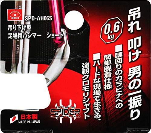 「SK11(エスケー11) SPIDER 足場用ハンマー 0.6kg ショート柄 SPD-AH06S」▼4977292133173▼(商品説明)0.6kg・Silver ショート柄 SPD-AH06S・・Size:ショート柄Style:0.6kg・用途:足場の・解体などの作業・特徴:腰回りのカラビナに直接脱着ができる携帯に便利な特殊形状のハンマー、取り回しに便利なショートグリップ・ヘッド重量:約600g、柄部長さ:約160mm・シャフト:熱処理済クロモリ・落下防止取付部:ステンレス製説明 腰回りのカラビナに直接脱着ができる携帯に便利な特殊形状のハンマー 【用途】 足場工事等 【特徴】 ・柄尻には、セフティコードを取り付けられるシャックル付きで、安全作業をサポート ・通常サイズより短いグリップ長になっているため、取り回しに便利で、狭い箇所でも活躍 【注意事項】 ※使用用途以外では使用しないでください。 ※本体にワレ・カケ・ヒビなどの異常が見られる場合には、使用を中止してください。 ※重大事故につながる恐れがあります。 ※打撃面以外での横打ちなどはしないでください。 ※本体の破損につながる恐れがあります。 ※セフティコードの取付けや、カラビナへの脱着時などは、確実に取付けができていることを確認してください。 ※作業中には、手袋や安全メガネなどの保護具を着用してください。