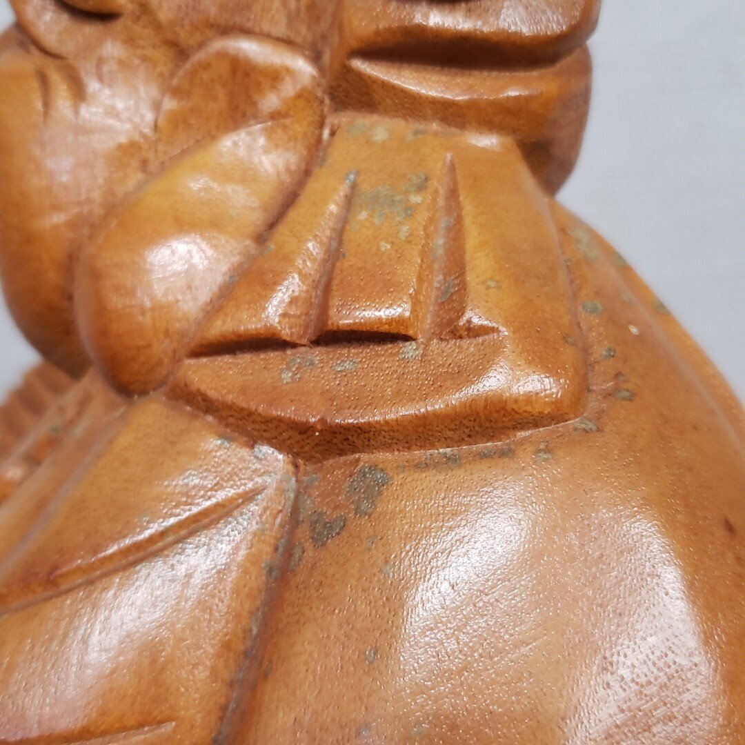 木彫りの布袋尊の置物です。底に銘がありますが読めませんでした。木箱はありません。経年による汚れ、擦れ、シミ、傷があります。