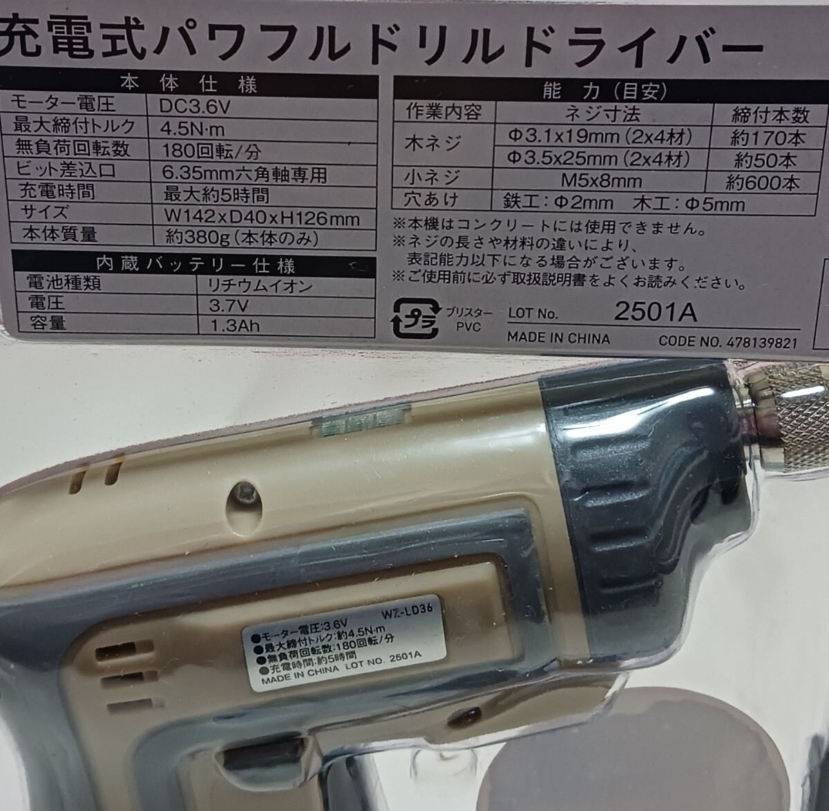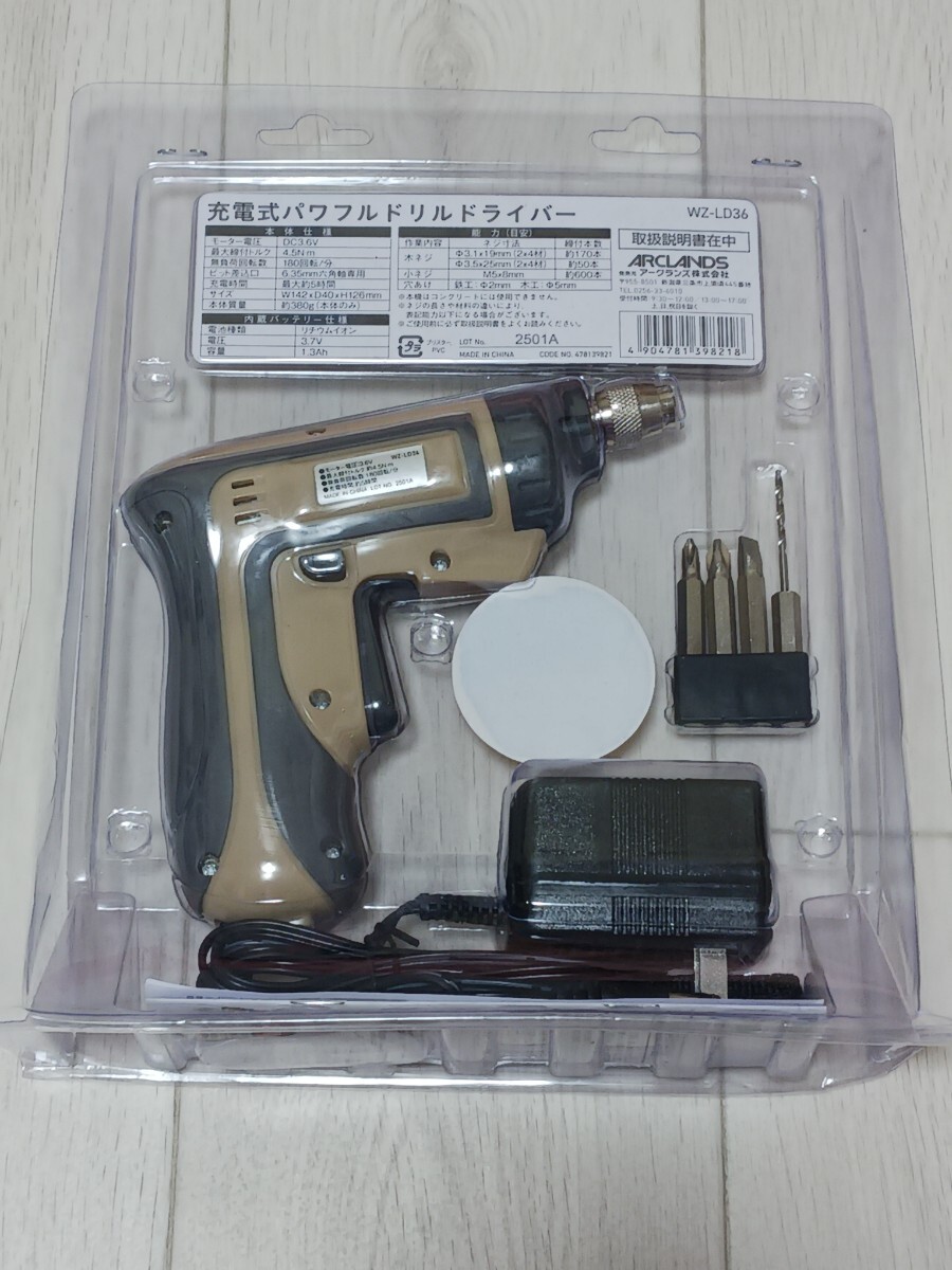 私が店頭で購入した新品商品です、よろしくお願いします 仕様 用途:各種組み立てDIY、ネジ締め外し、穴あけ作業の際に セット内容:本体、ビットホルダー、ドライバー片ビット×3本、六角軸ドリル刃×1本、充電アダプター モーター電圧:DC3.6V 最大締付トルク:4.5N・m 無負荷回転数:180回転/分 充電時間:最大約5時間 ビット差込口:6.35mm六角軸専用 穴あけ能力:鉄工2mm、木工5mm LEDライト付き 充電式 製品サイズ(mm) 幅×奥行×高さ:142×40×126 製品重量(g)380 |
