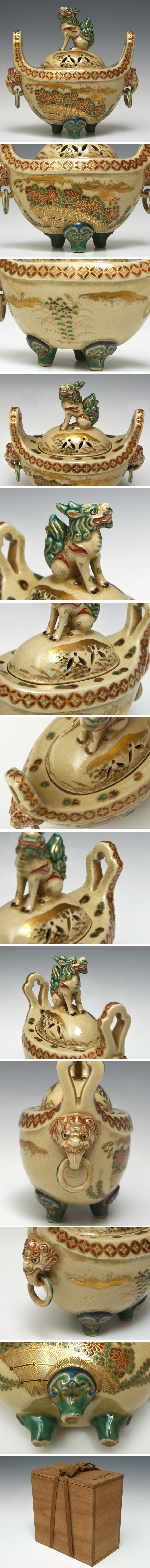 舟形の姿が美しい大型香炉です。 胴部の絵付けや、縁や脚部、獅子摘みなど細部に至るまで装飾が行き届いています。 古雅な釉調のもとに、金彩の華やぎと上絵の品格が見事に融合しています。 仁清意の上品な風格を伝える、時代を経た味わい深い作品です。 目立ったダメージ等なくコンディションは良好です。 ※予めご了承の上ご入札お待ちしております。 ※撮影の際に生じた写り込みなどがございます。 ご理解の程よろしくお願い致します。 |