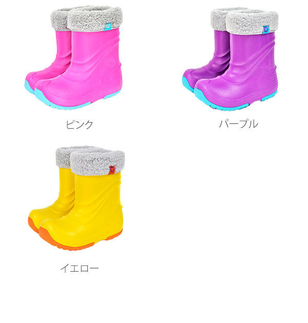 | 商品説明 | POOKIESより、オールシーズン対応のキッズスノーブーツです。 軽量で暖かく、脱ぎ履きがしやすい完全防水仕様なので、ボアを取り外せば、レインブーツにもなり、雨の日も雪の日もこれ一つで安心! 底にはラバーを埋め込み、滑りやすい、減りやすいと言われるEVA底の欠点をカバーしています。 ※レインシューズとしては、1cmは大きくなります。 |
