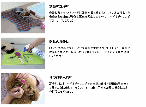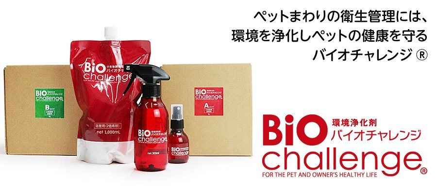 ■■ バイオチャレンジをご使用頂く前に ![]() ![]() ![]() ![]() ■■ バイオチャレンジのご使用方法 ペット飼養現場はどうしても汚れやすく、それが原因で様々な病気を引き起こします。飼養現場の衛生管理は、日頃の作業の中に浄化作業を組み込んでおくことで大幅に改善します。 バイオチャレンジは正しくご使用頂ければ皆様の飼養活動に大変役立つ、ペットの環境浄化剤ですので、毎日こまめに、ペットの部屋やペットが使う道具に噴射して清潔な環境を保持して下さい。 【スプレーボトルのみ】や【詰替えボトルのみ】の他、ペットショップやトリマー施設・動物病院・ドッグラン・ブリーダー様などにお得な【業務用パック(持続型・即効型)】 もございます。 ワンちゃん以外にも、ネコやウサギ等の小動物にもOK! ▼スプレーボトル・・・・・・希釈せずに、そのままスプレーしてお使い頂ければOKです。 ▼詰替用1Lボトル・・・・・・水道水で2倍に薄め、専用スプレーボトル入れてお使い下さい。 ▼業務用10Lボトル・・・・・水道水で2倍に薄め、専用スプレーボトル入れてお使い下さい。
