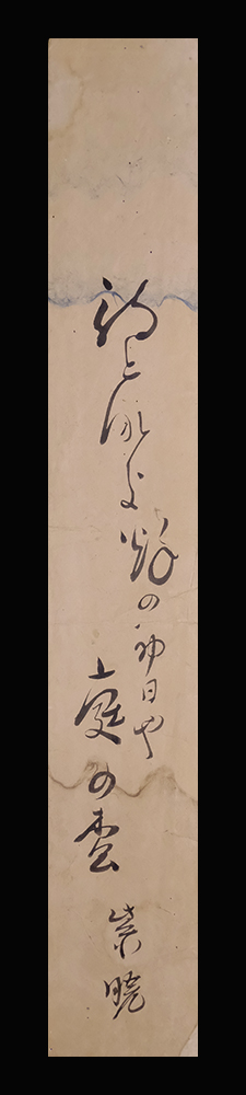 【翻字】 「待(まつ)となきの初日や庭の松 紫暁」 紙本(内曇入)肉筆未装短冊1点 作品寸法:35.8cm x 5.4cm 商品状態:実際の品を画像にてお確かめ下さい。 ★本品は印刷ではなく肉筆保証の作品です。 ★本品は真作保証の作品です。 宮紫暁(みや-しぎょう) 1745-1806?。江戸時代中期-後期の俳人。 延享2年生まれ。京都の茶屋主人。高井几董(きとう)の門人で,春夜楼2代をついだ。几董一周忌の「鐘筑波(かねつくば)」,与謝蕪村(よさ-ぶそん)十七回忌の「常盤(ときわ)の香」などの追善集,紀行「歩月の章」,年々の歳旦帖など俳書の刊行がおおい。没年は文化3年ごろ。別号に聴亀庵,春宵楼。 出典:講談社『デジタル版 日本人名大辞典+Plus』 |