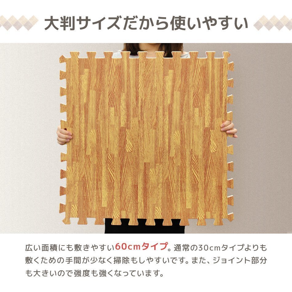 | 60cm 大判 ジョイントマットです。 カッターやはさみで簡単に切れるのでレイアウト自由自在! 足音をやわらげてくれるので、子供部屋やフローリングのお部屋に最適です! 適度なクッション性が転倒時に衝撃を和らげてくれます! 冬は床下からの冷気をカット! 夏は冷房による温度を効率よく保ちます。 汚れた部分は取り外して水洗いが出来てカンタンお手入れ♪ 嬉しい!サイドパーツ付き! 壁ぎわに敷いても、隙間なくキレイに。 掃除がラクラク!! 自然をイメージした木目デザイン! お部屋に落ち着いた雰囲気を与えてくれます! 【商品仕様】 カラー:ブラック サイズ(約):幅60×奥行60×厚み1.0cm(※1枚) (設置目安サイズ(約):121×121cm(正方形)) 素材:PE素材 【商品内容】 ジョイントマット 32枚 サイドパーツ(角付きパーツ32本、角なしパーツ32本) ※床材との温度差で製品が反る場合があります ※入荷時期によって厚みや幅に多少の誤差がある場合がございます ※商品はモニターによって色合いが異なって見える場合があります (マット 木目 木目柄 WEIMALL WEIWEIホールディングス) |