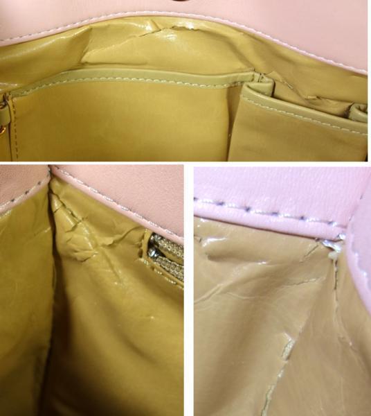 使用品ですのでしわ、汚れや擦れはあります。型くずれもある箇所もあります。バックの内側は内張りに変色、破れや若干べたつきが有る箇所もあります。また内張りの破れは自然と劣化しているようです。破れた箇所から細かい粒子みたいな物が落ちてきます。内張りの張替か上から何かつけるしかないです。ご自分でご対処ください。内側のファスナーポケットのファスナーつまみがないです。バックのサイズはW21xH21xD12cm位です。持ち手の長さは34cmくらいです。