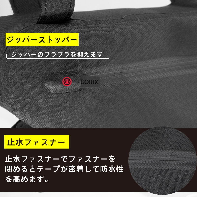 | ロードバイクやクロスバイク、マウンテンバイクなどのフレームに取付けできる自転車用フレームバッグ 空きスペースを有効活用して荷物を収納できます。 ジップは広く開ける事ができきるので取出しも楽々。 また防水対応で汚れにも強いのでサイクリングに最適です。 ・ペダリングの邪魔にならない幅サイズ ・柔軟に調整できるベルト位置 フレーム形状にあわせて組み替えできます。 ・水や汚れに強い素材 水漏れ防止高防水3層生地仕様 防水ファスナーでさらに防水効果をあげます。 破れにくい生地でタフなフレームバッグ ・ボトルケージなども入る容量1.8L 片面のサイドポケットはスマホなどの収納に ・夜間安心の反射ロゴ 夜間反射機能・事故防止などの安全対策に 暗闇でライト等の光に反射して存在をアピールし 追突などのリスクを軽減 サイズ:約長さ40x高さ12.5、幅6cm 重量:約390 g 商品内容:バッグx1、テープx5、説明書x1 附属ベルト取付可能径:約φ3-5cm 最大容量:約1.8L 自転車に取付位置:フレーム 防水仕様:防水レベルIPX4 適用フレームMAXサイズ:MTB/ロードバイク/クロスバイク ※自車のフレームサイズと合うとか必ず確認してください! 《ご注意》 ・商品は入荷によりキズがある場合があります。 保証対象外になりますのでご了承お願い致します。 ・ディスプレイ環境により実物と色が異なる場合が有ります。 ・入荷時期により予告無く一部仕様変更する場合が有ります。 ・車種、サイズによって取付できない場合があります。 形状やサイズなどををご確認の上ご購入下さい。 | |