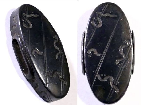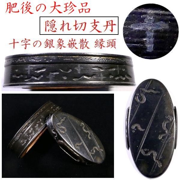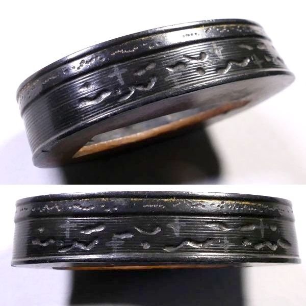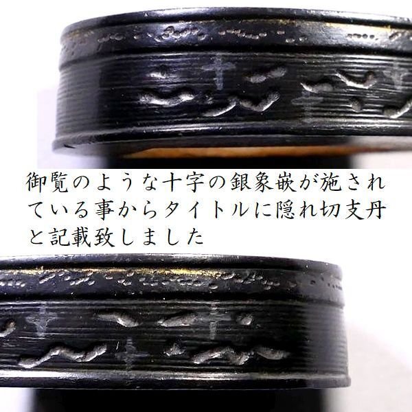 | 商品説明 | 材質:赤銅地 上質な赤銅地に 繊細な毛彫細工の施された一品です。 作行から見て肥後の大珍品と推測しており 縁には十字の銀象嵌が散らされている事から 隠れ切支丹ではないかと推測しております。 詳しくは画像にてご確認下さい。 滅多に出てこない一品かと存じます。 是非、お手持ちのコレクションの一つに加えて下さい。 全体に見て状態は概ね良好です。 しととめを入れる穴の片方に欠損が見られますので 画像にてご確認下さい。 その他、古い物ですので多少の時代傷みはご理解下さい。 状態等詳しくは画像にてご判断下さい。 |