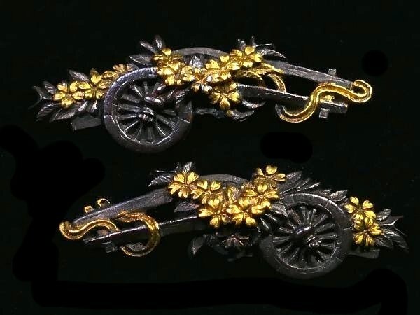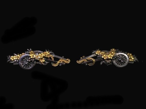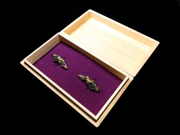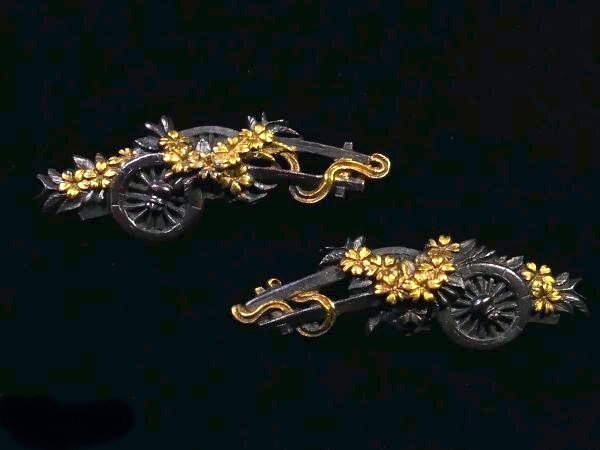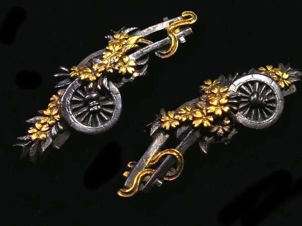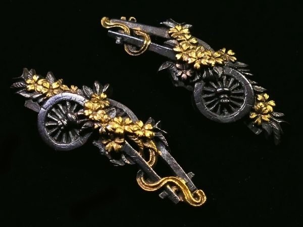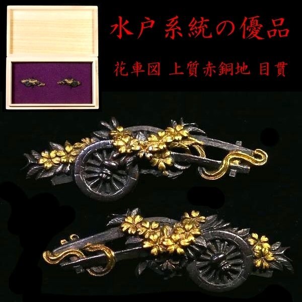 | 商品説明 | 材質:赤銅地 御覧の様な花車図 目貫のご紹介です。 上質な赤銅地とそれに栄える金色絵に彩られた 繊細な細工の花車図が施された 拵栄えする一品です。 作行から見て水戸系統の優品と推測しております。 詳しくは画像にてご確認下さい。 鑑賞用にも拵用としても幅広く活躍する一品と思います。 是非お手持ちのコレクションの一つに加えて下さい。 特に気になる傷みは無く概ね良好です。 古い物ですので多少の時代傷みはご理解下さい。 状態等詳しくは画像にてご判断下さい。 |