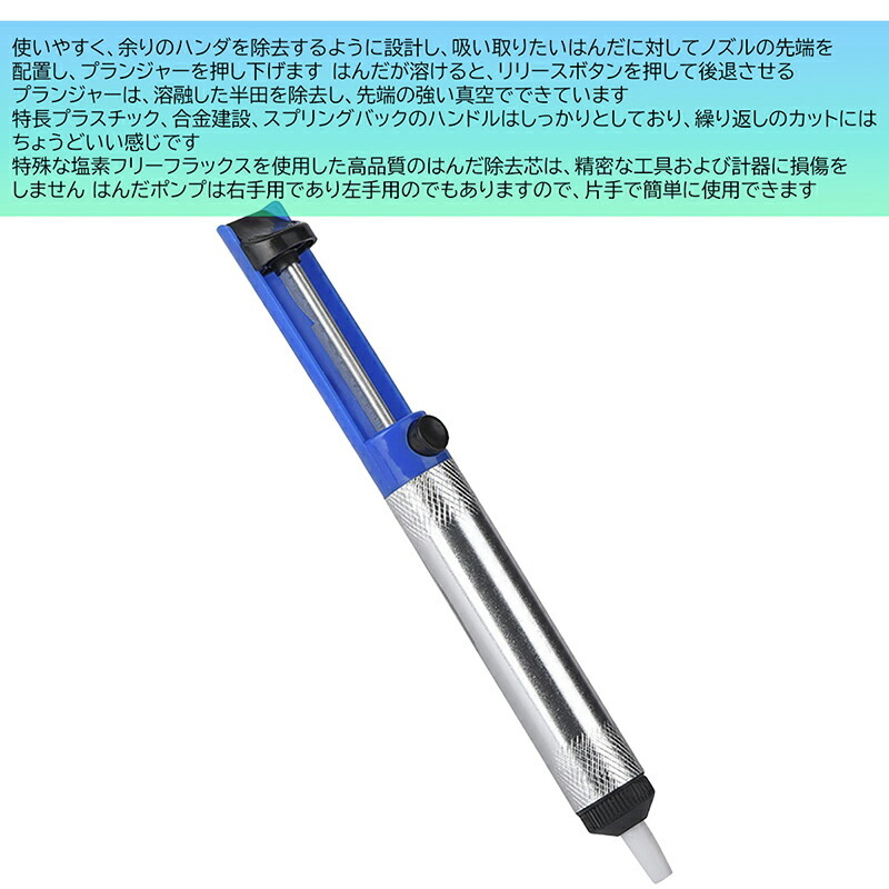 使いやすく、余りのハンダを除去するように設計し、吸い取りたいはんだに対してノズルの先端を配置し、プランジャーを押し下げますはんだが溶けると、リリースボタンを押して後退させるプランジャーは、溶融した半田を除去し、先端の強い真空でできています