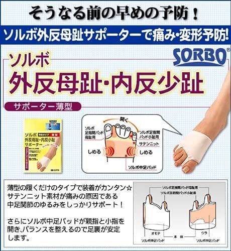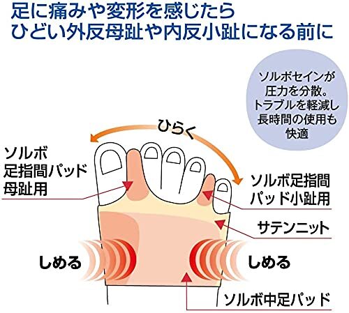 説明 変形がひどくなる前に外反母趾・内反小趾の痛みを緩和します。 薄型の履くだけのタイプで装着が簡単。サテンニット素材が痛みの原因である中足関節のゆるみをしっかりサポートします。ソルボ中足パッドが足底から母趾突起部分にかかる圧力を分散し、ソルボ足指間パッドが親指と小指を開き、バランスを整えるので、足裏が安定します。靴を履くときは、シワやズレがないように調整し、靴下を着用してください。