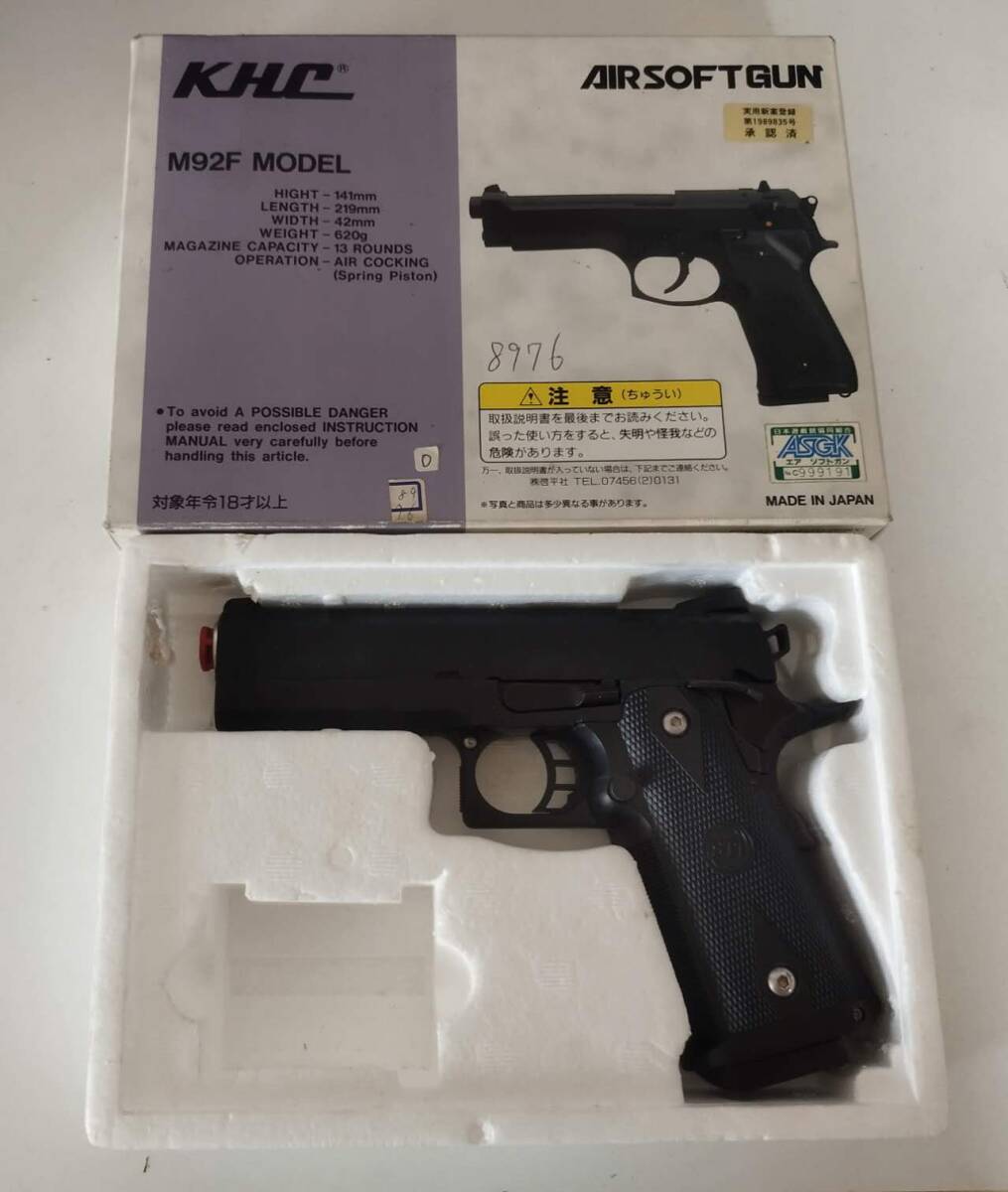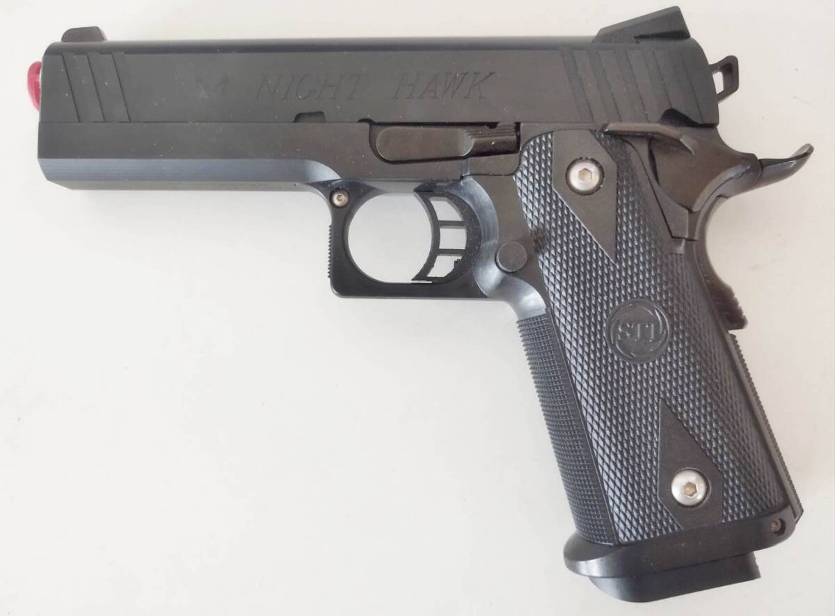 KSC製STI ナイトホーク 中古品の出品となり、経年により多少な擦り傷、汚れ、色落ちなどが出て来てしまいましたが、全体的に見ればまだ綺麗な状態であり、金属部品を多用、マガジン含みの重さ890gとなり、確認しました、ガス漏れには全然しません、ブローバック作動し、弾が順調的に出ます、スライドストップもしっかりと作動します、元マガジンが付き、おまけの代用箱も付いております