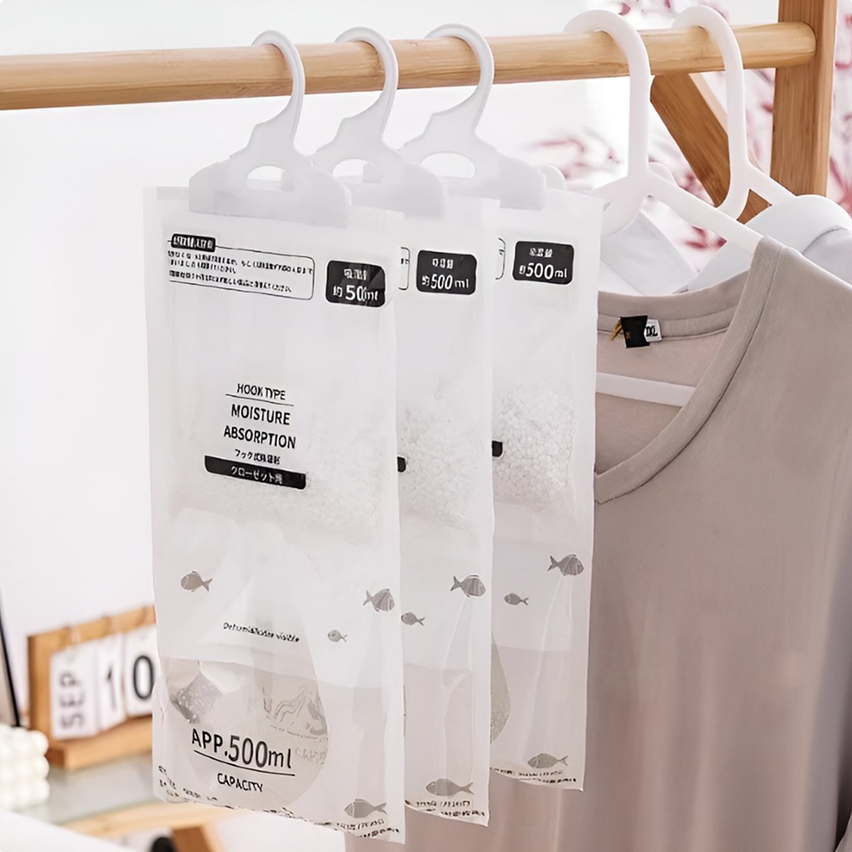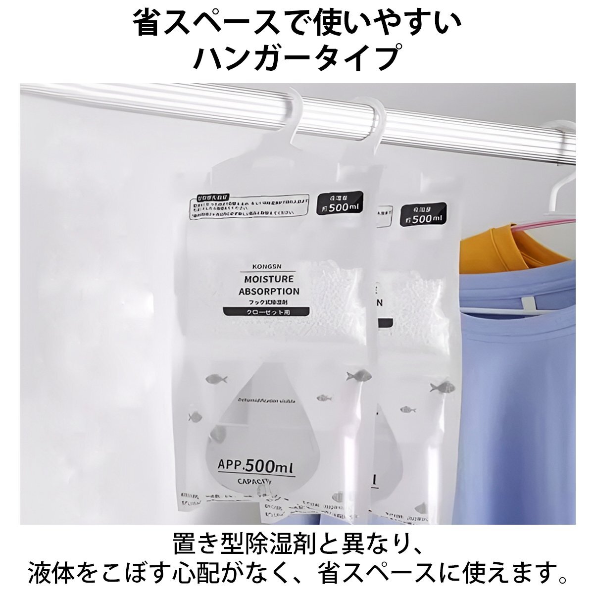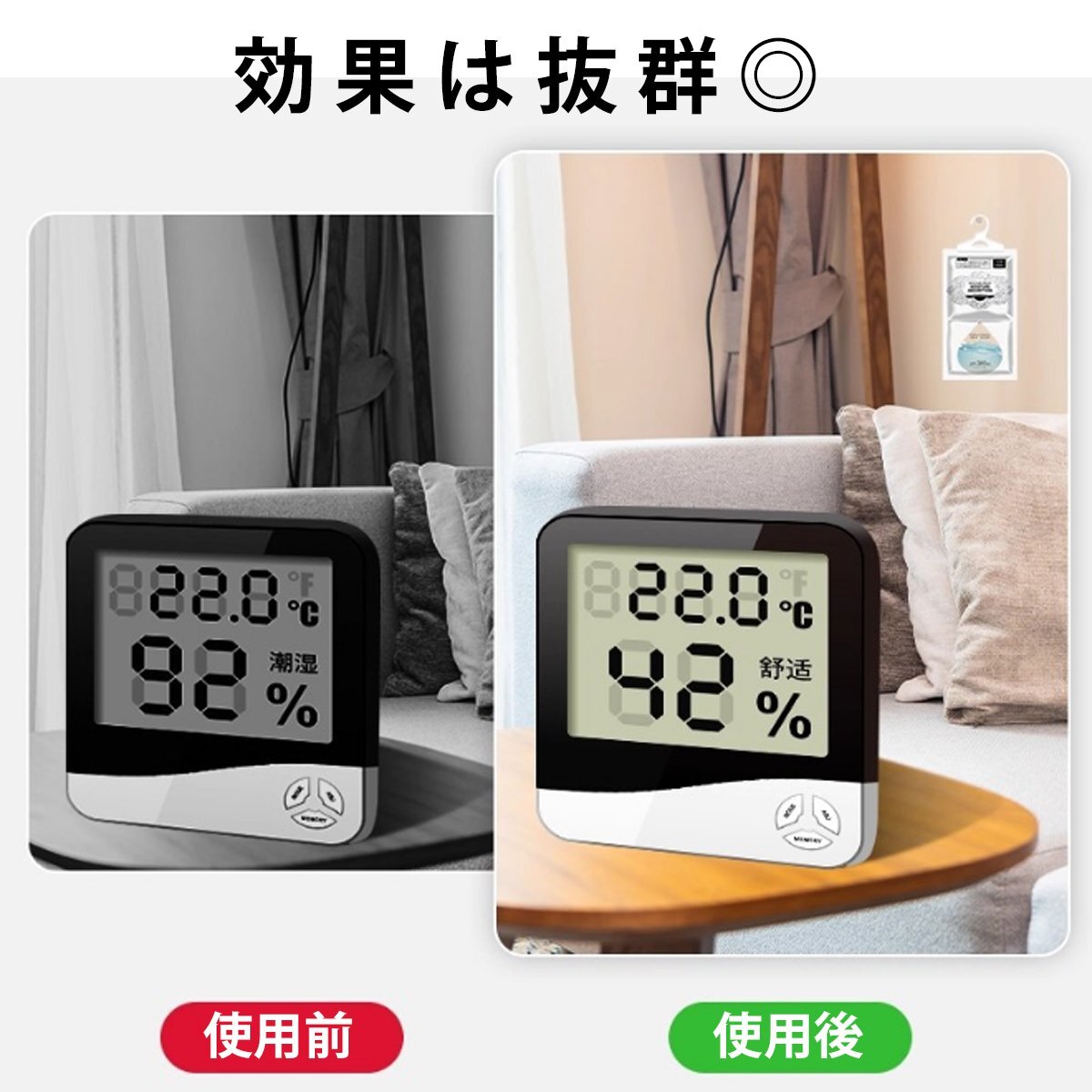 吊り下げ式 ハンガータイプの除湿剤です。 クローゼットにこもった湿気が大切な服をカビさせてしまいます。 そんな時はこの吊り下げるだけの除湿剤が活躍! 除湿剤の残量や除湿力が一目でわかる構造。吸収した湿気はパックに溜まっていきます。 最大除湿量は驚異の「500ml」 使用後は手で破いて、溜まった液体を水道水と一緒に流して捨てるだけ。 吊り下げられる箇所ならどんな場所でも使用できるミニマルで可愛いデザイン。 商品詳細 サイズ(約):高さ30cm×幅16cm 除湿量:500ml 除湿剤:250g |