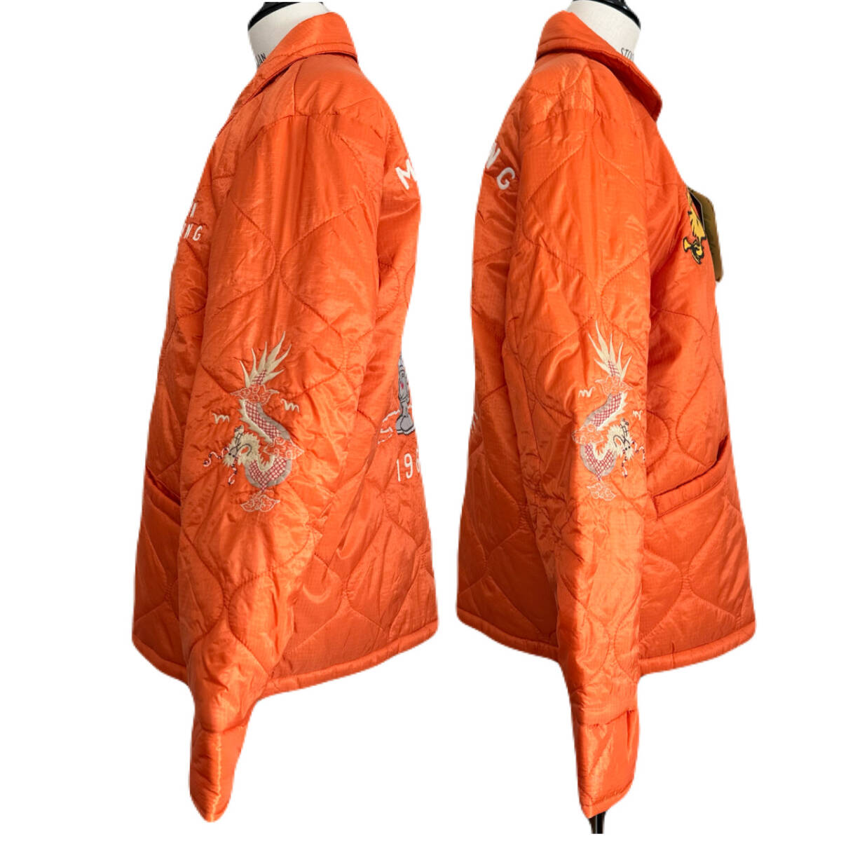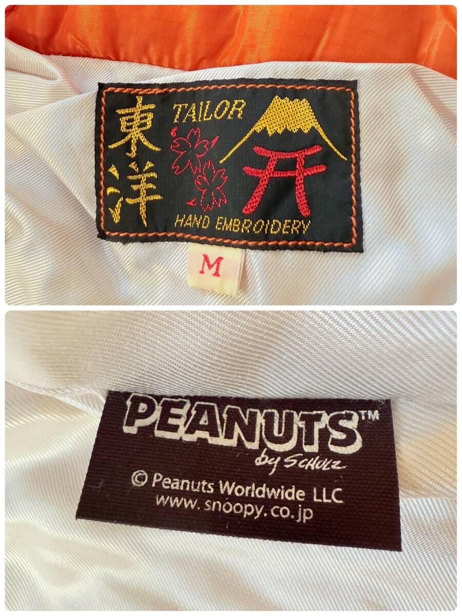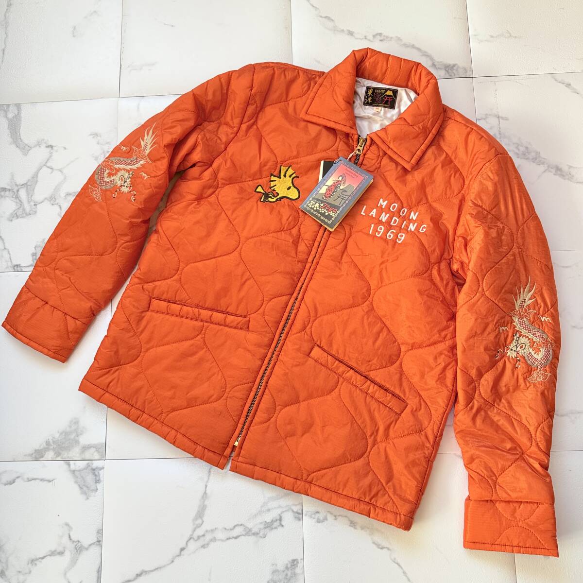 テーラー東洋×ピーナッツ・コラボ TT14209 "MOON LANDING/スヌーピー"ベトナムライナージャケット/ベトジャン オレンジ 廃盤 デッドストック になります。 ★スカジャンの老舗ブランド、テーラー東洋から刺繍の技術を存分に活かした、ピーナッツとのコラボ作品、2018年冬物新作、TT14209 "MOON LANDING/スヌーピー"ベトナムライナージャケット/ベトジャンのご紹介です。 ヴィンテージでもレアなオレンジのライナー生地を使用したモデルが登場。 1969年のアポロ11号月面着陸を記念し、同年にベトナムに駐留していた米兵がカスタムオーダーしたもの。当時、スヌーピーはNASAのアポロ計画の公式マスコットであり、単色のポンチョライナー生地で仕立てたベトジャンに宇宙服を着たアストロノーツスヌーピーを刺繍しています。 胸元に「ウッドストック」、両袖には「龍」がデザインされています。刺繍は旧式の刺繍手法で描かれ、ビンテージ感が演出されています。 素材は、表地に柔らかなナイロン100%のポンチョライナー生地を使用し、裏地には柔らかで光沢感のあるアセテート100%生地を使用しています。 薄いキルティング生地のポンチョライナーは軽量で保温性もあります。 フロントジップには「UNIVRSAL」社製を使用。 軽くて暖かいアメカジ、ミリタリー、バイカー系ファッションにはピッタリのこれからの季節に重宝しそうな定番アイテムです。 ★品番 No.TT14209 ★サイズ M ★カラー オレンジ ★定価 37.400円 ★平置きサイズ 肩幅46㎝ 身幅56㎝ 着丈65㎝ 袖丈60㎝ 多少の誤差はご了承下さい。 ★状態 未使用 良い状態です。自宅保管品もご理解の上、ご検討頂けましたら幸いです。 | ||||||||