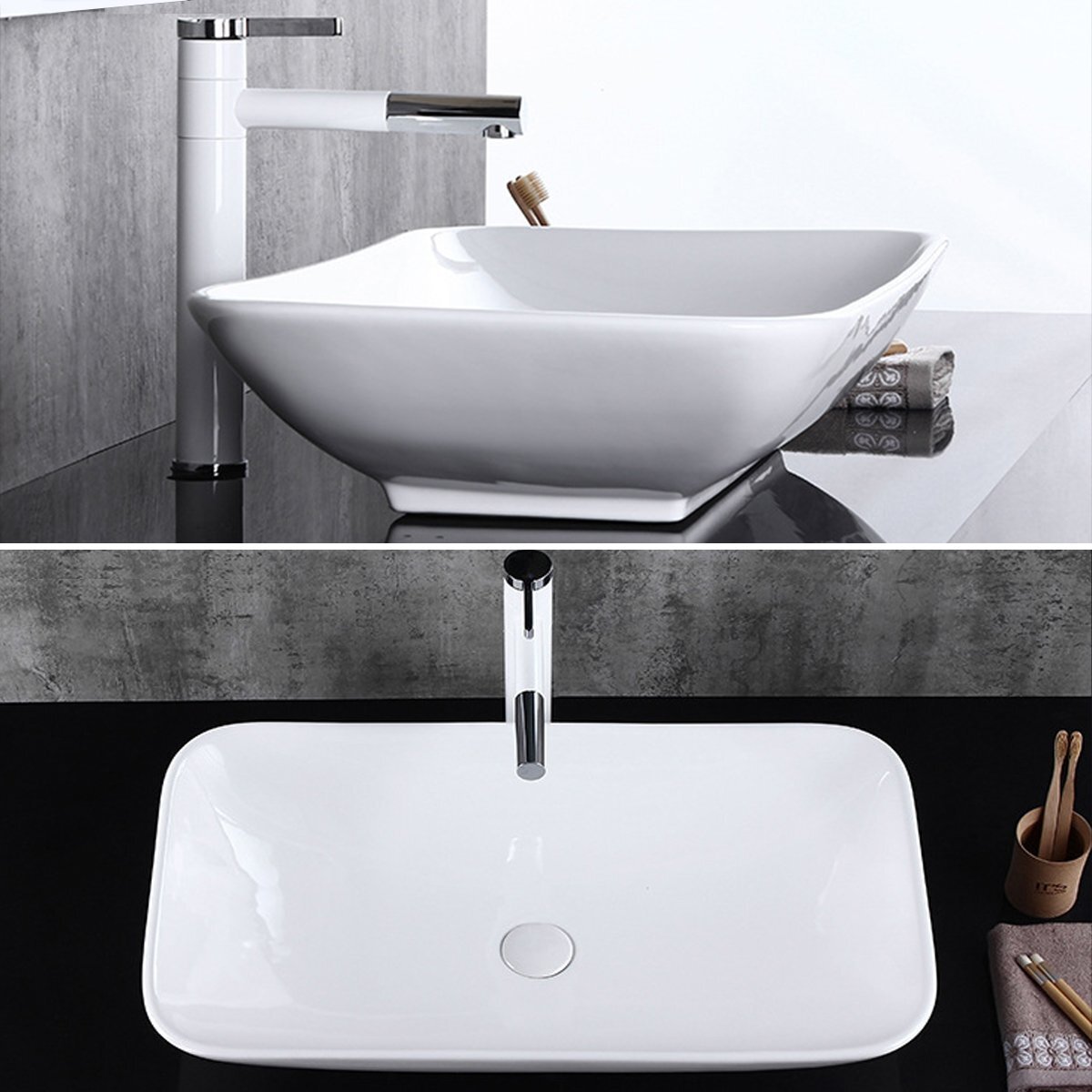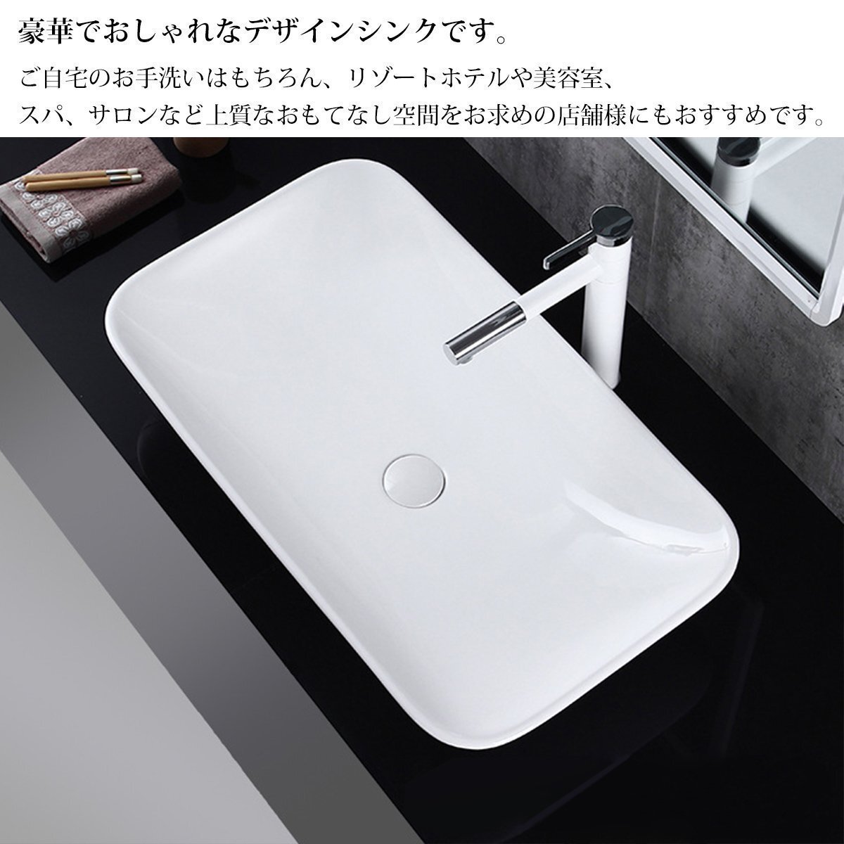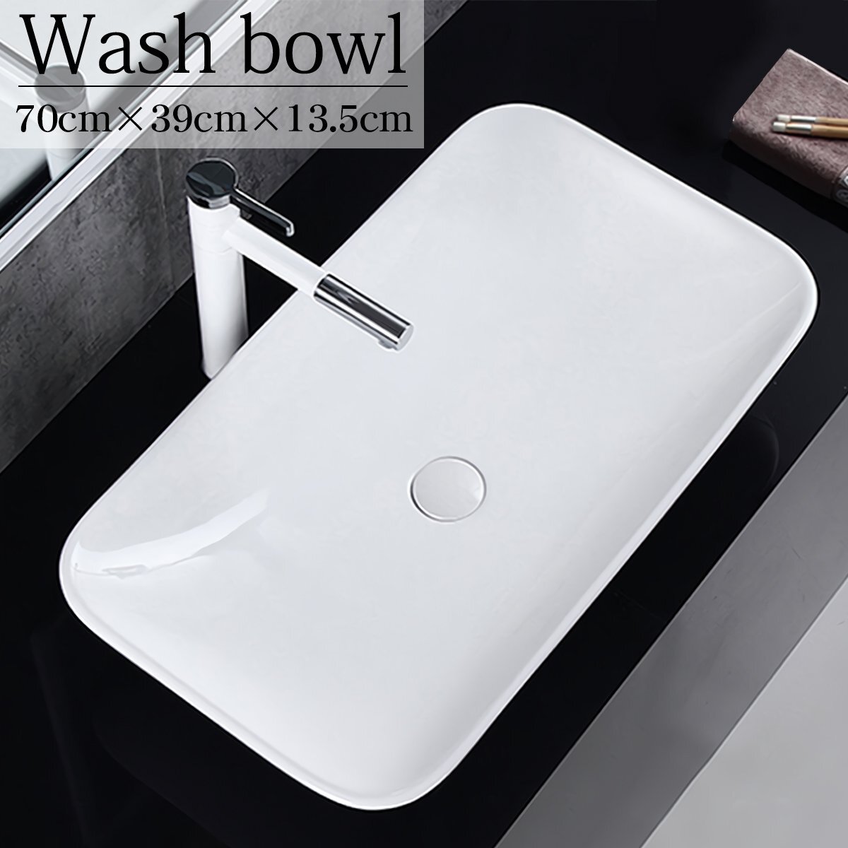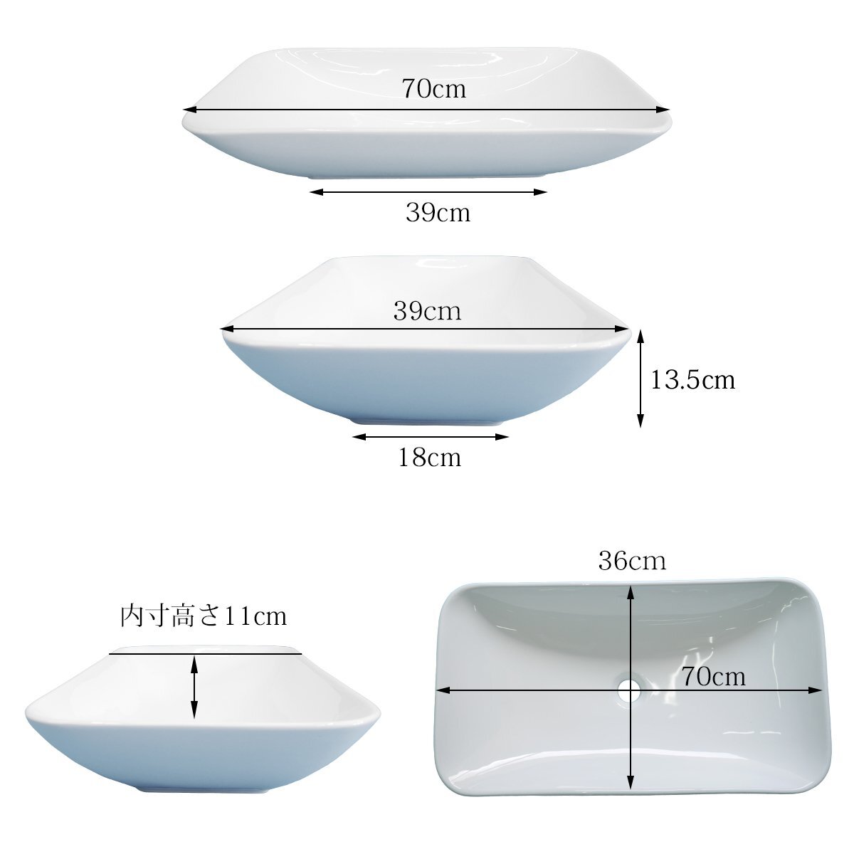 個性的な直角デザイン、真白な色は視覚的に清潔で快適な印象が残されます。 上質な陶器が高級感を漂わせ、空間にすっと溶け込みます。 そして、汚れが付きにくく、濡れた布でふくだけでキレイになります。 カウンターに据え置くスタイルの洗面ボウル。 豪華でおしゃれなデザインシンクです。 ご自宅のお手洗いはもちろん、リゾートホテルや美容室、スパ、サロンなど 上質なおもてなし空間をお求めの店舗様にもおすすめです。 手洗い鉢と排水ホースセットでの販売で排水金具は蓋を押すことで開閉します。 陶器は特殊加工3段塗装されております。 ・カラー:ホワイト ・商品サイズ外寸(約):高さ13.5cm、横上部70cm、横下部39cm、奥行き上部39cm、奥行き下部18cm ・商品サイズ内寸(約):高さ11cm、横70cm、奥行き36cm ・排水ホース(約):排水上部直径6cm、排水下部直径3cm、高さ38cm~80cm ・重量(約):12kg ・材質:陶器(セラミック)、ステンレス ※説明書は付属しておりません。 ※取り付けサポートは行っておりません。 ※こちらの商品は蛇口が付属しておりません。 |