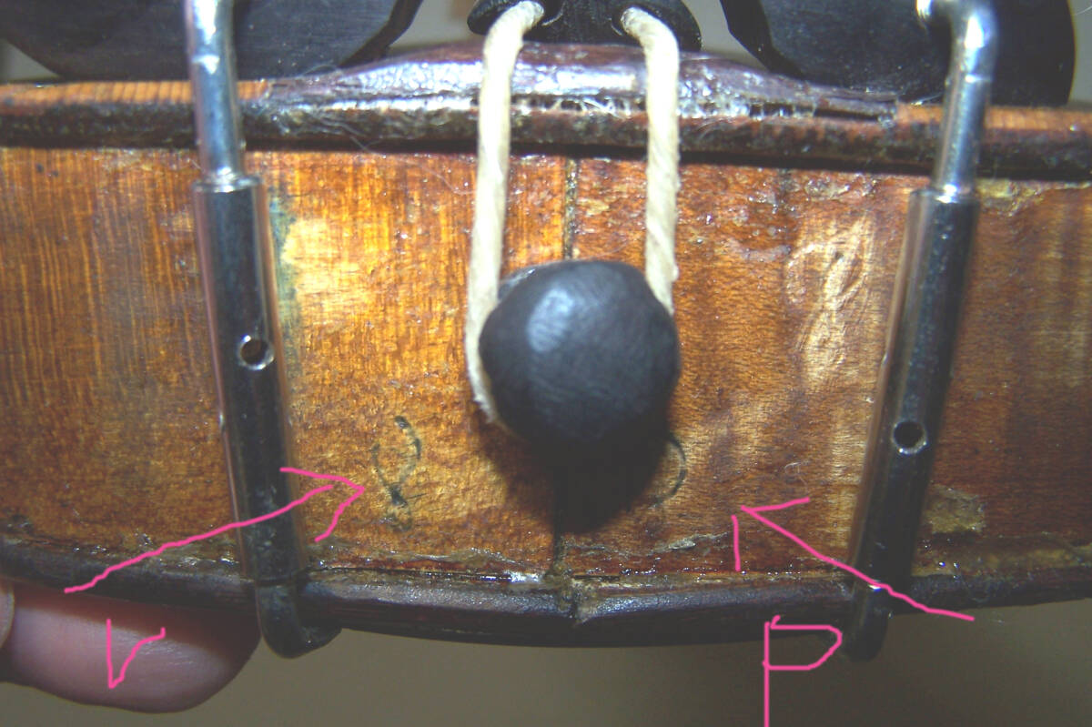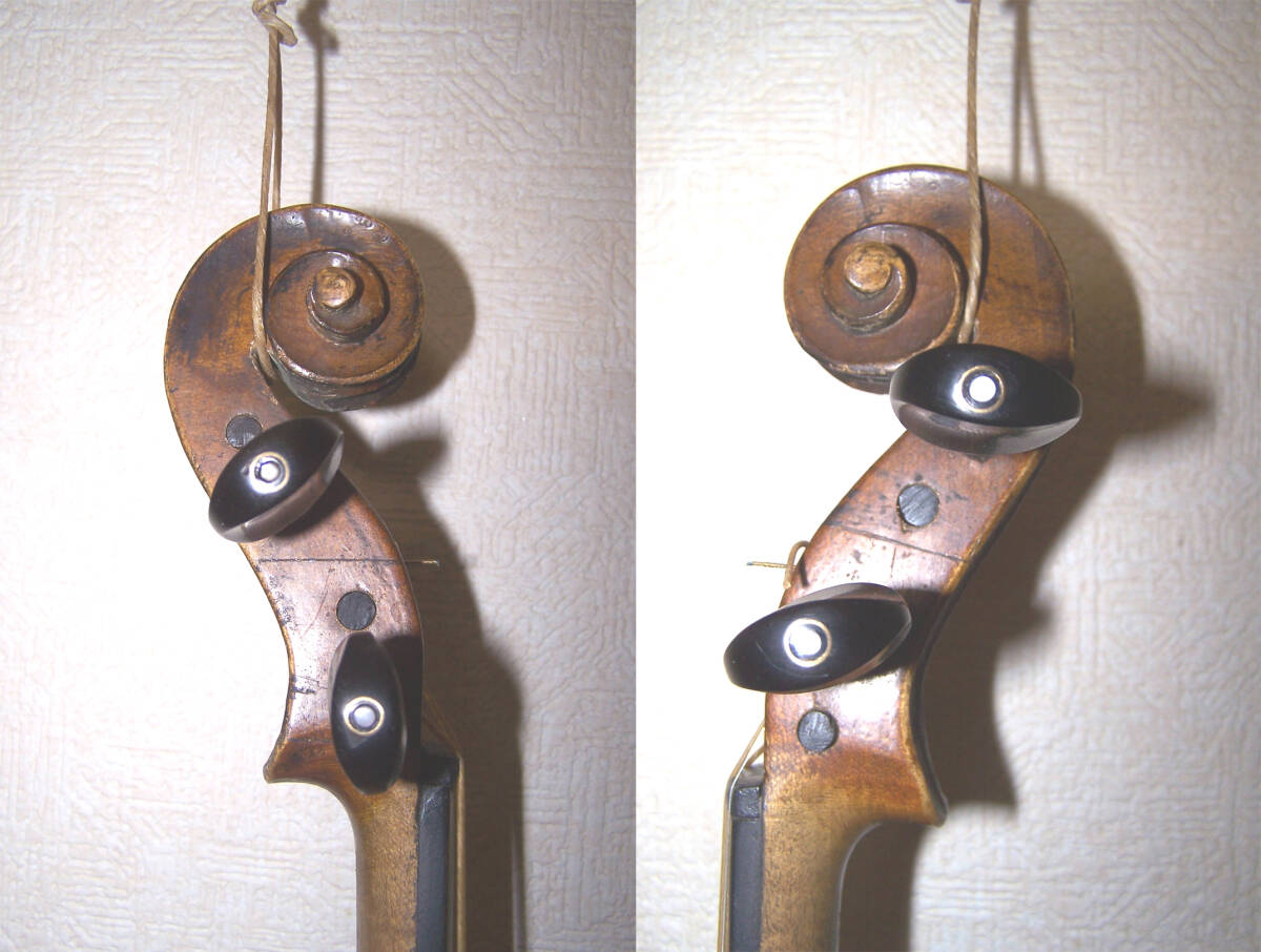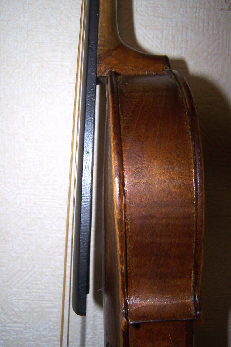 ネックの画像を見るとわかりますが、スクロールの部分から下が交換されているのがわかります。ネックの前端の画像6に見られる木質の新しい感じがその証拠とも云えると思います。全くのフェイクならこのようなことをするのは無意味です。しかし20世紀初頭の楽器ですので、ネックが低い可能性はありません。となるとこのようなタイプのネックに変更したということになります。