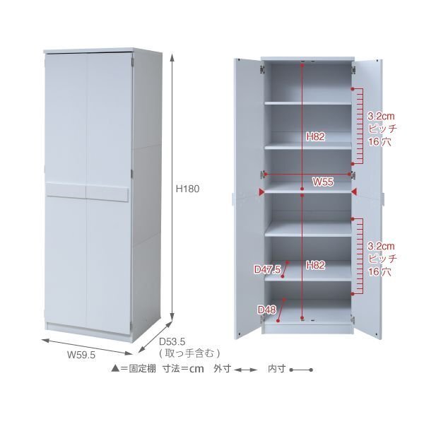 | 【カラー】 ダークブラウン、ホワイト 【サイズ】 <外寸> 幅59.5×奥行53.5×高さ180cm <内寸> 扉内上段:幅55×奥行48×高さ82cm 扉内下段:幅55×奥行48×高さ82cm 可動棚:幅55.5×奥行47.5×厚み1.7cm(3.2cmピッチ16穴) 【材質】 本体:プリント紙化粧合板 【耐荷重】 固定棚/可動棚:(約)20kg以下 【生産国】 ベトナム 【梱包】2梱包でお届けします。 2-1 サイズ:67×56×18cm、重量:23.0kg 2-2 サイズ:91×53×16cm、重量:19.8kg 【その他】 ・可動棚:4枚 ・六角レンチ同梱 【組み立て品】 お客様による組み立てが必要です。 【ご注意】 ・サイズ、重量は概算です。 ・商品カラーはご使用のモニターによって実際の明るさや色と異なって見える場合がございます。 |