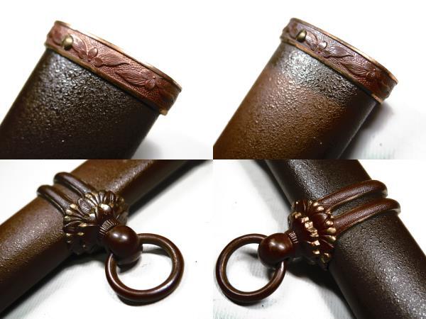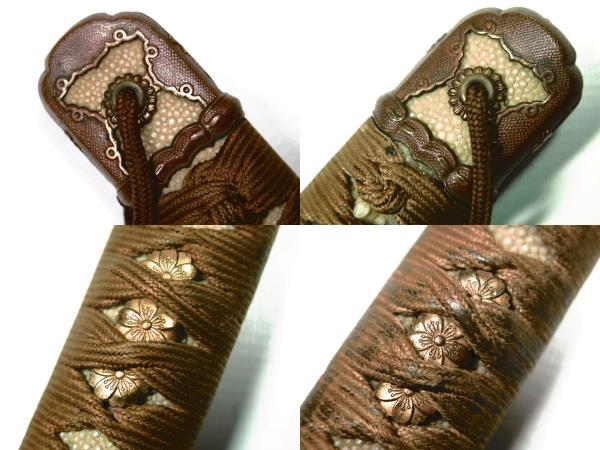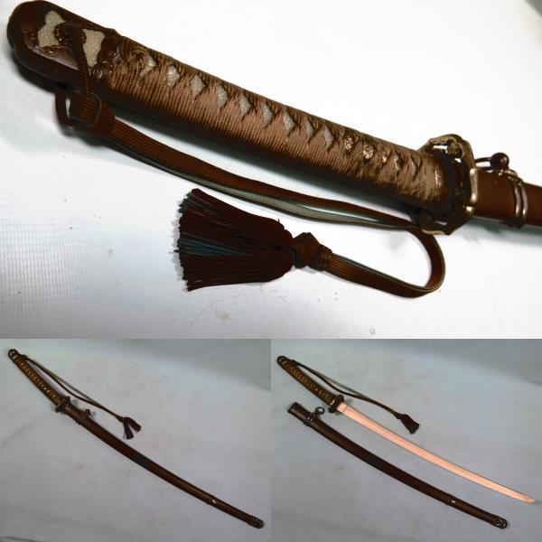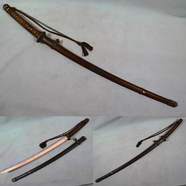 日本陸軍 98式軍刀拵え 鉄鞘/透かし鍔 鍔/縁/切羽8枚通し番号有 刀緒付 です。もしかしたら希少な一品かも知れません。鍔と縁と切羽8枚に同一番号が刻印があります。刀緒痛み変色あり駐爪はありません。元々本身が入っており、床の間に飾ってあった為、日焼けにより表と裏の色がちがいます。当方、専門家でありませんので、質問等に関しましてご返答出来ない場合もあり・時間がかかる場合もございますのでご了解下さい。最近、悪戯・購入意思のない方のご入札が多く、当方の判断にてこれらの方は削除いたしますのでご了解下さい。評価の悪い方(ご入札を削除いたします/落札後でも削除いたします)・新規の方(ご入札を削除いたします)悪戯・興味本位の方はご入札は御遠慮下さい。お分かりの方、格安出品いたしますので、ぜひこの機会に、インティリア・コレクション・資料の一つに加えて見てはいかがでしょうか。写真参考にて時代価値材質名称真贋等ご自身の責任にて最終ご判断下さい。撮影時、光源・角度によって実際の色と、微妙に違う場合がありますのでご了解下さい。古い品にご理解ある方で、神経質の方、新品・完品をご希望の方はご遠慮下さい。落札後、御連絡・ご入金・受け取り完了ご連絡等速やかに対応できる方のみ入札をお願いいたします。古い品ですので、汚れ部品不足擦り傷使用感等は御理解下さい。寸法/ 全長106cm 柄26cm 鞘79cm 繋ぎ68.5cm 元払いにて発送 ノークレームノーリターン その他、希少な品多数出品いたしております。色々と時代物、珍しい物、掘り出し物が出て来ましたので、その他のオークションも覗いて見てはいかがでしょうか。きっと何かが見つかるかも知れません。