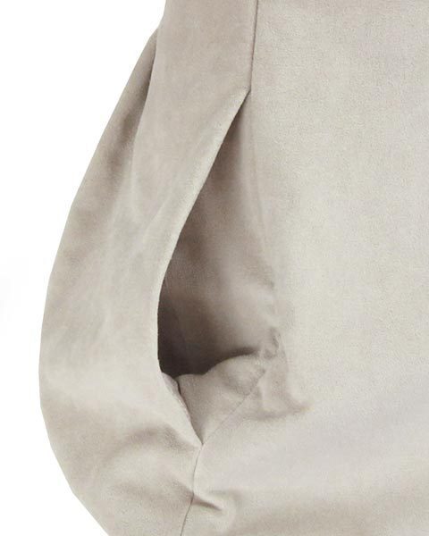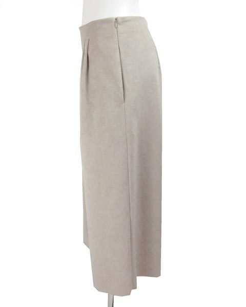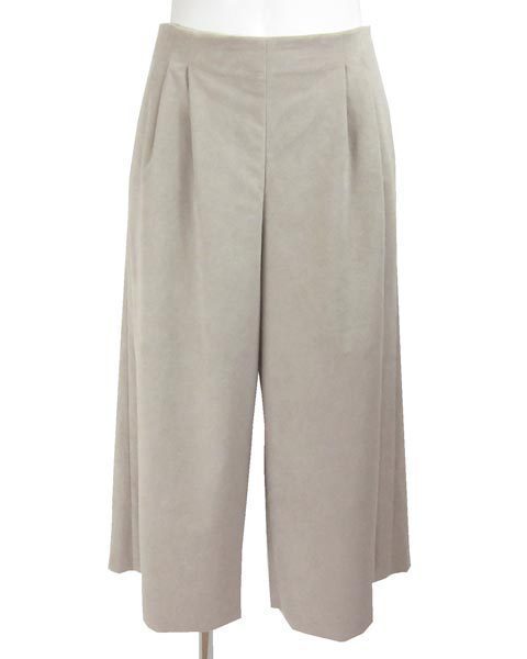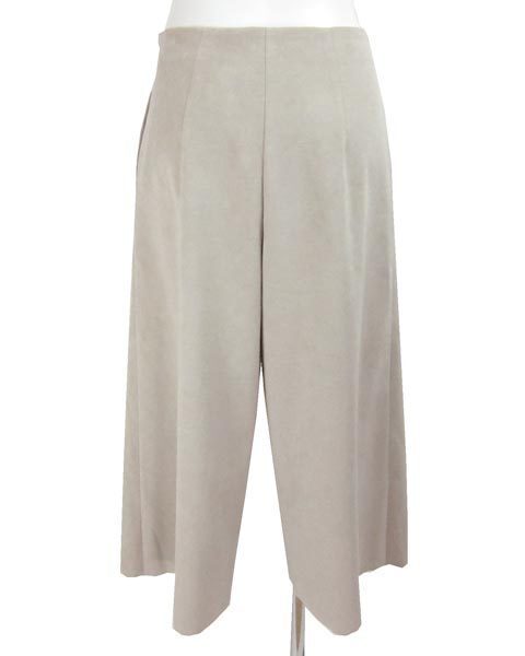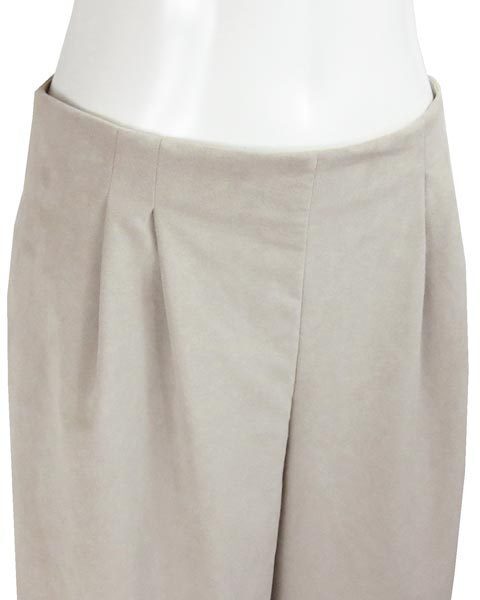| 上品なグレージュのフェイクスウェードパンツ。ゆったりシルエットのキレイ目パンツ。きちんと感のあるスタイルからカジュアルスタイルまで幅広くスタイルが楽しめます。 |