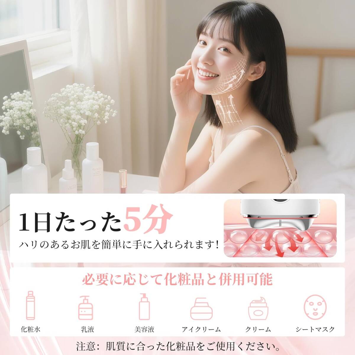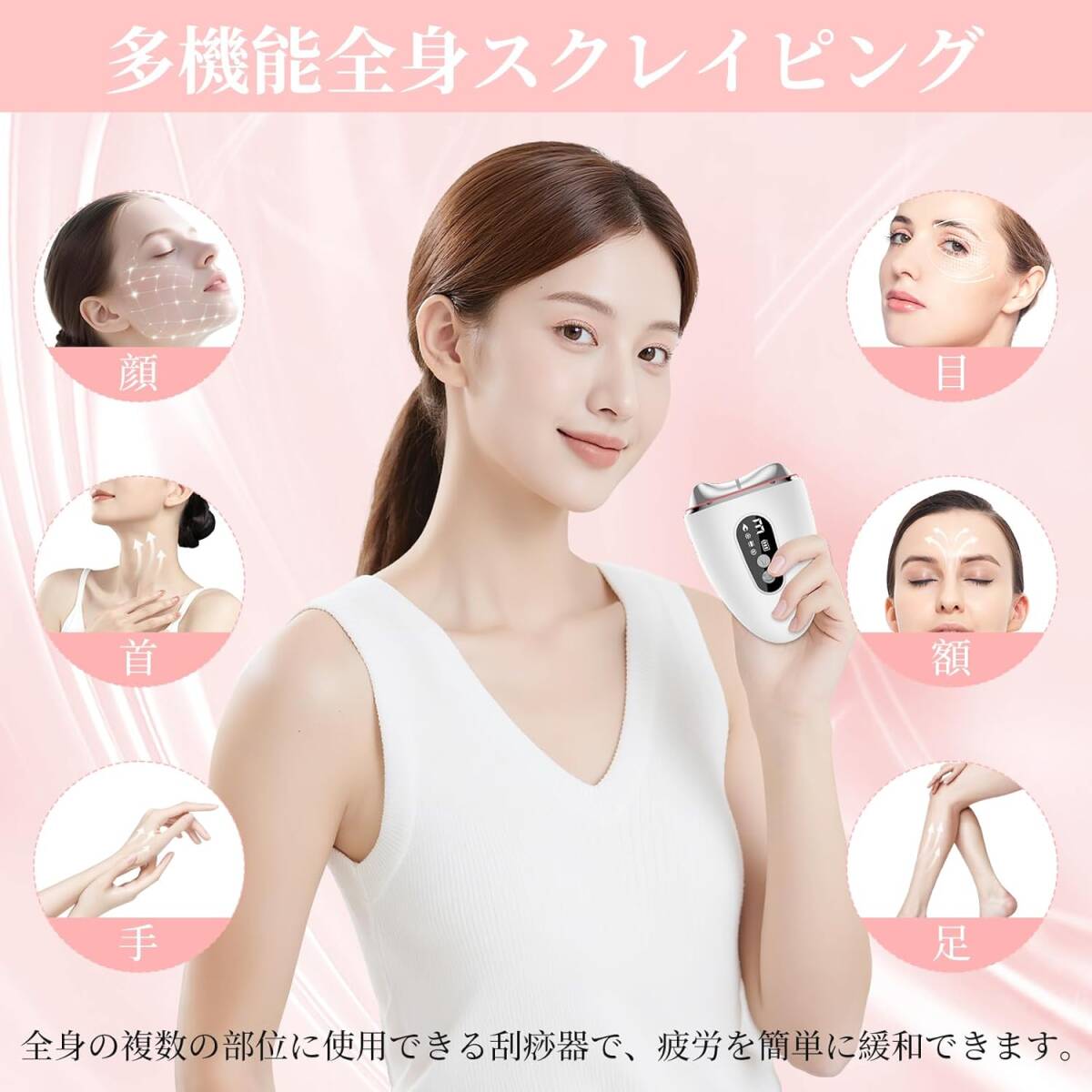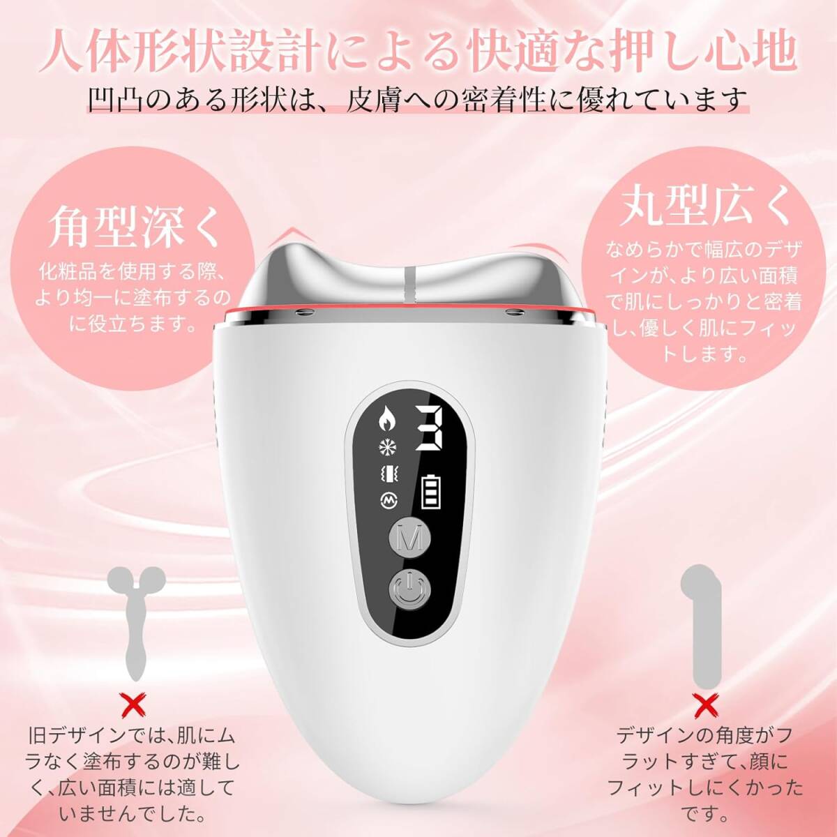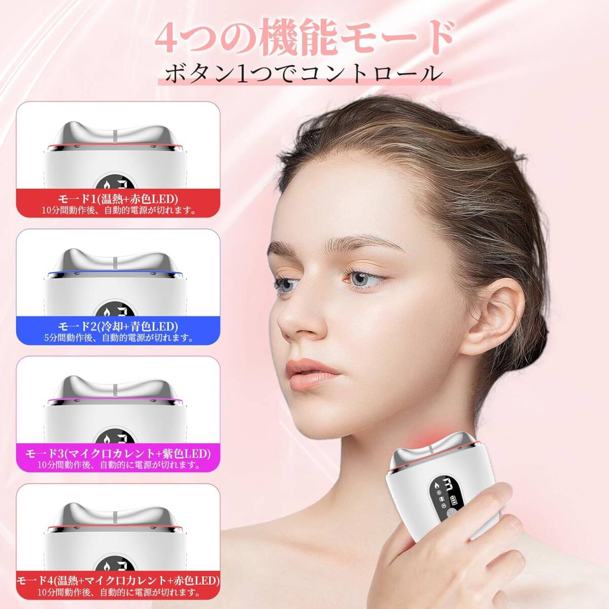 EMSスキンケア機能を搭載した多機能美顔器、温熱・冷却・光機能を兼ね備え、デジタル表示で操作も簡単。 - 機能: EMSスキンケア、温熱、冷却、3種類の光機能 - デザイン: 人間工学に基づいた形状、角型と丸型のデザイン - 使用方法: 顔や体に使用可能、85度のウェーブカーブ - 表示: デジタル表示、温度とモードが確認可能 - 素材: 高品質プラスチック、耐久性あり 【4つの機能とモード】:モード1:温熱(熱)+赤色LED。モード2:冷却(冷)+青色LED。モード3:EMS+紫色LED。モード4:温熱(熱)+EMS+赤色LED。 【温冷両モード】この美容器は温冷両モードを採用しています。お好みに合わせて調整可能です。 【人間工学に基づいたデザイン美顔器】EMS美顔器は多機能設計を採用し、人間工学の原理に準拠したデザインで、顔の輪郭に完璧にフィットします。外装デザインは手のひらにフィットする曲線を採用し、握りやすく、操作が簡単で、初心者でもすぐに使いこなせます。顔、首、手、足、脚、背中など全身の部位に使用可能です。 【使いやすく多機能】この美顔器は軽量で持ち運びやすく、入浴後、洗顔後、オフィスや旅行時など、さまざまなシーンでご利用いただけます。USB充電式を採用しており、1回の充電で最大1週間使用可能です。EMS、温熱パック、冷パック、高周波振動機能を搭載した多機能設計で、多様な機能を簡単に実現できます。美顔器の形状はコンパクトで軽量のため、外出時でも手軽に持ち運びでき、いつでもご要望に応えることができます。 【保護モード】この多機能EMS美顔器にはスマートな安全保護機能が搭載されています。モ一ド1(温熱:10分間動作後、自動的に電源が切れます。モ一ド2(冷却:5分間動作後、自動的に電源が切れます。モ一ド3(マイク口力レント:10分間動作後、自動的に電源が切れます。モ一ド4(温熱+マイク口力レント:10分間動作後、自動的に電源が切れます。初めて使用する際は、低強度から始めることをおすすめします。