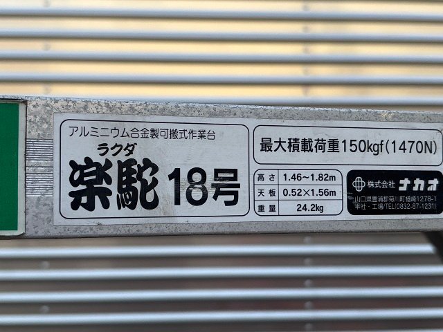 | タイトル | 【1円スタート!】ナカオ アルミニウム合金製 可搬式作業台 楽駝18号 最大荷重150kgf 足場 ※直接引き取り限定※ |