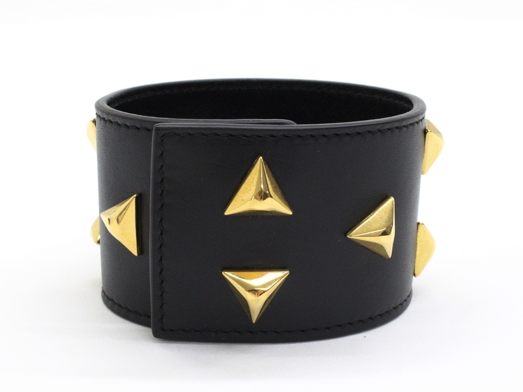 8万新品◆M◆Saint Laurent◆黒レザー×ゴールドスタッズ太バングル【サンローラン】