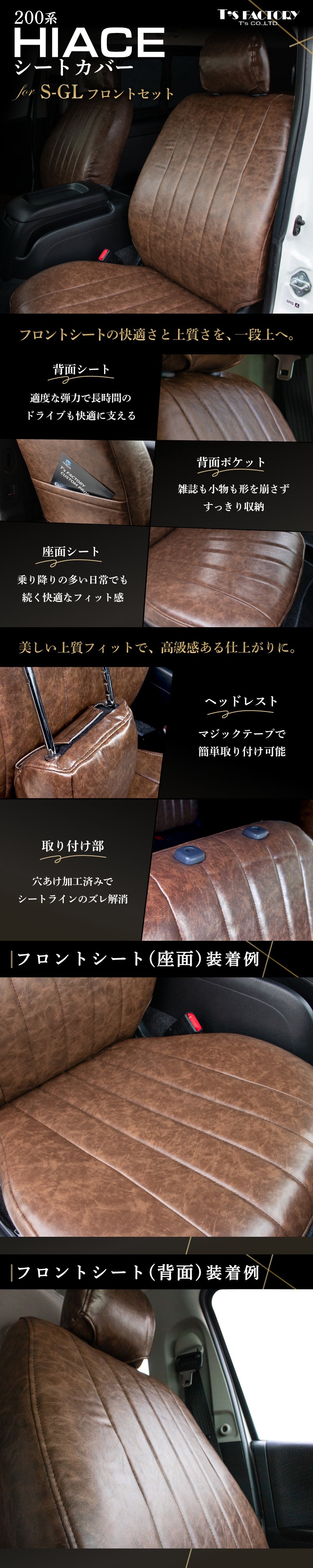 ティスファクトリーのシートカバーにレトロなスタイルを演出するブラウンカラーが登場! 時を重ね使い込まれたソファのような深みと趣のある素材を採用し、 リビングで過ごしているような、落ち着いた雰囲気へ車内の印象をデザインします。 200系ハイエースバンS-GLナロー(標準)ボディ、ワイドボディに対応いたします。 ※特別仕様車 ダークプライム、ダークプライム2 対応 また、ワゴンGL、グランドキャビンのフロントシートに対応いたします。 (フロントシートのみのセットです。ワゴンGL、グランドキャビン、コミューター用のリアのセットはありません。) バンDX、コミューター、ワゴンDXには取り付けできません。 新品商品(運転席、助手席、ヘッドレスト2個)フロントシートセットになります。 <特徴> ブラウンカラーの生地には最大10mm厚のスポンジを使用し、クッション性を向上、 フィッティングを重視したつくりで、まるで張り替えたかのような仕上がりです。 背もたれ部、座面にはレトロなスタイルを意識した縦ラインのステッチを使用し、 ブラウンカラーとのヴィンテージな風合いを演出します。 運転席、助手席にはリアポケットを装備し、雑誌や小物などの収納に便利です。 クラシックなシングルステッチ縫製を採用し、ステッチ部分に厚みを持たせ、 風合いとデザイン性を高めてシートラインの美しさを強調させます。 ヘッドレスト取り付け部は穴あけ加工済みですので、位置取りがしやすく取り付け時の シートラインのズレを解消させました。 シート部、ヘッドレスト部はマジックテープでの取り付けで簡単取り付け。 説明書付きなので初めての方でも安心して装着できます。 |