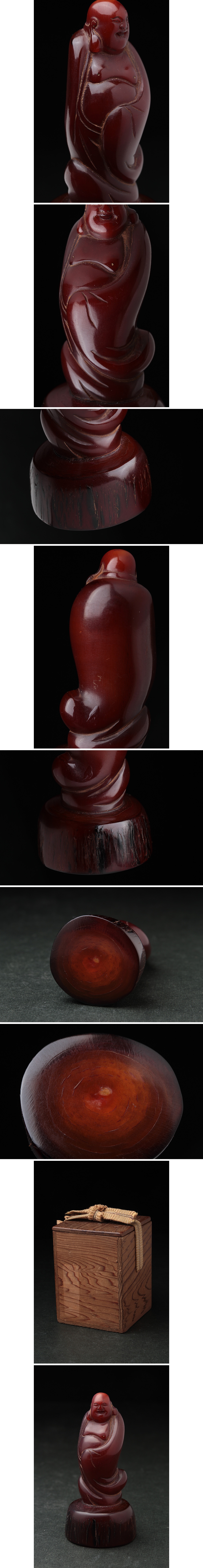 | ◆ 中国古玩 唐物 古角材/角彫「布袋像」高7.6cm / 重45g 木箱・老角雕弥勒布袋像・大肚弥勒佛 縁起物 中国古美術 ◆