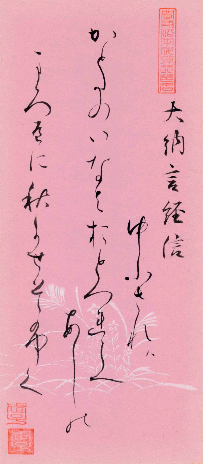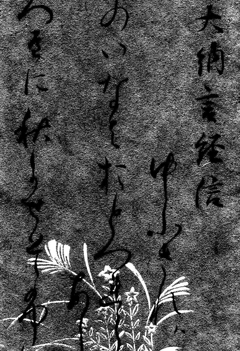 伊達孝子(たかこ)の和歌は「ちらし書」と呼ばれる書法です。文字を散らして布置するわが国独自の書き方です。この書法の歴史は平安時代の康保3年(967)の「紙背仮名消息」(滋賀・石山寺)、同じく平安時代の公卿・藤原公任(きんとう)自筆『北山抄』「仮名消息」(京都国立博物館)が知られております。各行に高低の変化をつけ、流暢(りゅうちょう)に続く連綿はきわめて美しいもので「百人一首」の書法として平安時代の公卿卿などの間で広まり、その後大名家の姫君の間で用いられておりました。