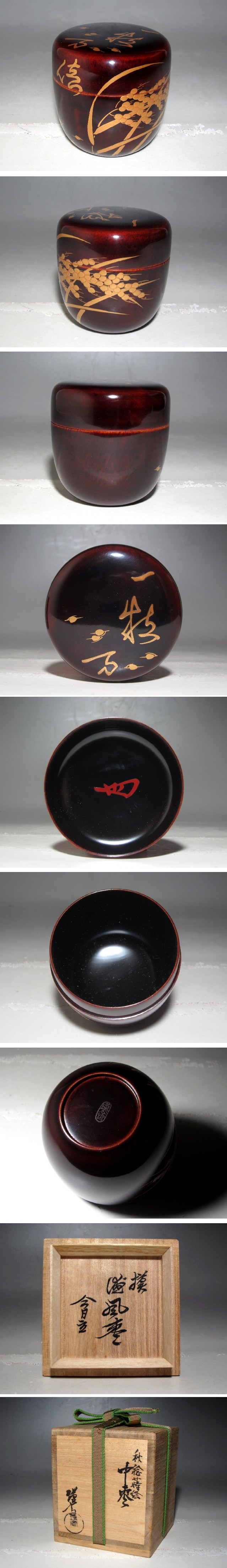 和田喜太郎作の徳風棗です。 趣のある美しい景色の名品です。 蓋裏に裏千家十四世淡々斎の花押があります。 底部に銘があります。 サイズ 直径6.5cm/高さ7cm(多少の誤差はお許しください) 状態 一見して疵やヒビ・直しは見られません。。 骨董品という事をご勘案頂き、時代経過のスレや、小さな傷がある場合があるかもしれませんのでご承知置きください。 | |||