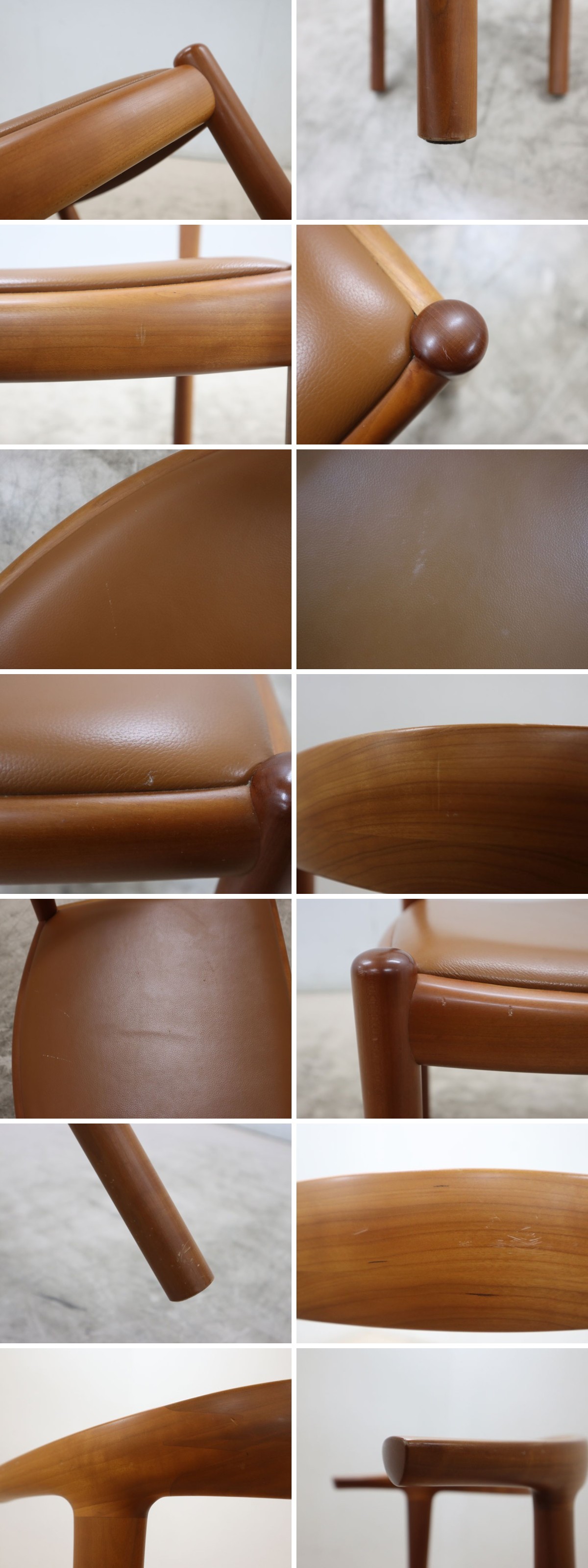 【仕様】 サイズ:約 W59.5×D53×H73・SH42 AH66.5cm ※実寸の為、多少の誤差はご了承下さい。 素材:チェリー材、本革 カラー:ブラウン系 (画像は100%正確な色味では御座いませんので気になるお客様は世田谷区船橋の倉庫でご覧頂けます。色味による返品、返金等は一切お受けできませんのでご了承の上でご入札をお願い致します。) 参考価格:187,000 円(93,500 円×2) |