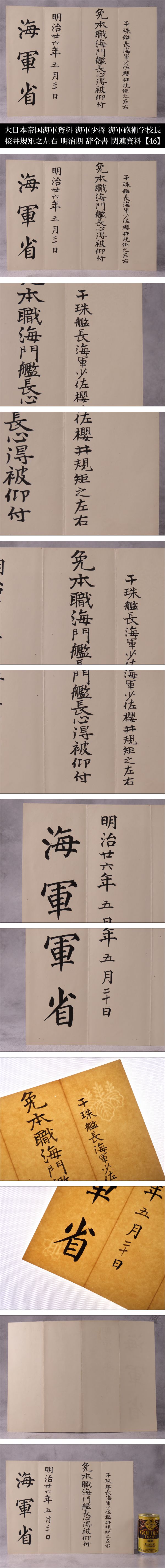 | Lot.20260423HA251129OSX/10 ※ご入札いただいた時点で下記記載事項全てにご了承いただいたものとさせていただきます。 ※商品タイトルは当方判断に基づき記載しております。また単にキーワードとして記載している場合もございますので予めご了承ください。 【ONE'S】大日本帝国海軍資料 海軍少佐 海軍砲術学校長 桜井規矩之左右 明治期 辞令書 関連資料 海軍省 明治二六年五月二十日 【46】 桜井 規矩之左右(さくらゐ きくのすけ) 嘉永元年6月6日(1848年7月6日) - 大正元年(1912年11月27日)64歳没 日本の武士、大日本帝国海軍の軍人。海軍兵学校3期。最終階級は海軍少将。 海軍砲術学校長、巡洋艦「比叡」「松島」「千歳」「橋立」の艦長を歴任。 日清戦争において比叡艦長として特に黄海海戦で功績を残しました。 彼の貢献は日本の海軍史において重要な位置を占めています。 《幕末の佐倉藩に生まれ、海軍の礎を築いた「海の侍」。日清戦争・黄海海戦にて、絶望を希望に変えた奇跡の突撃。敵の巨大戦艦に包囲され、沈没か降伏かの絶体絶命の淵に立たされた軍艦「比叡」。その極限状態の中、桜井は「敵陣中央突破」という戦術の常識を超えた決断を下した。炎の中を突き抜けたその一閃は劣勢だった日本海軍を奮い立たせ、日本の運命を変えた伝説の男。》 なかなかお目にかかることのないお品物をこの一期一会のご機会にぜひ。 【商品状態】 掲載画像をご覧下さい。 あくまでも年代物かつ一度人の手に渡っているお品物のため、汚れ、変色、経年による劣化等があるものとお考えいただき、神経質な方のご入札はお控えください。 PC上の画像と商品の色目が若干異なる場合がございます。 説明文に記載のある品物や写真に写っているもの以外は基本的に付属致しておりません。 落札後のトラブルを避ける為にも、説明文および画像をよくご覧になってから、ご入札のほどよろしくお願い致します。 商品状態の記載に関してはあくまでも当方判断基準となっております。 状態等の詳細は写真をご確認いただき購入者各自のご判断にてご入札ください。 | |||