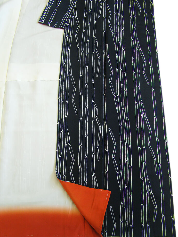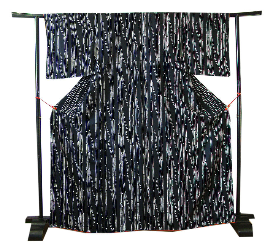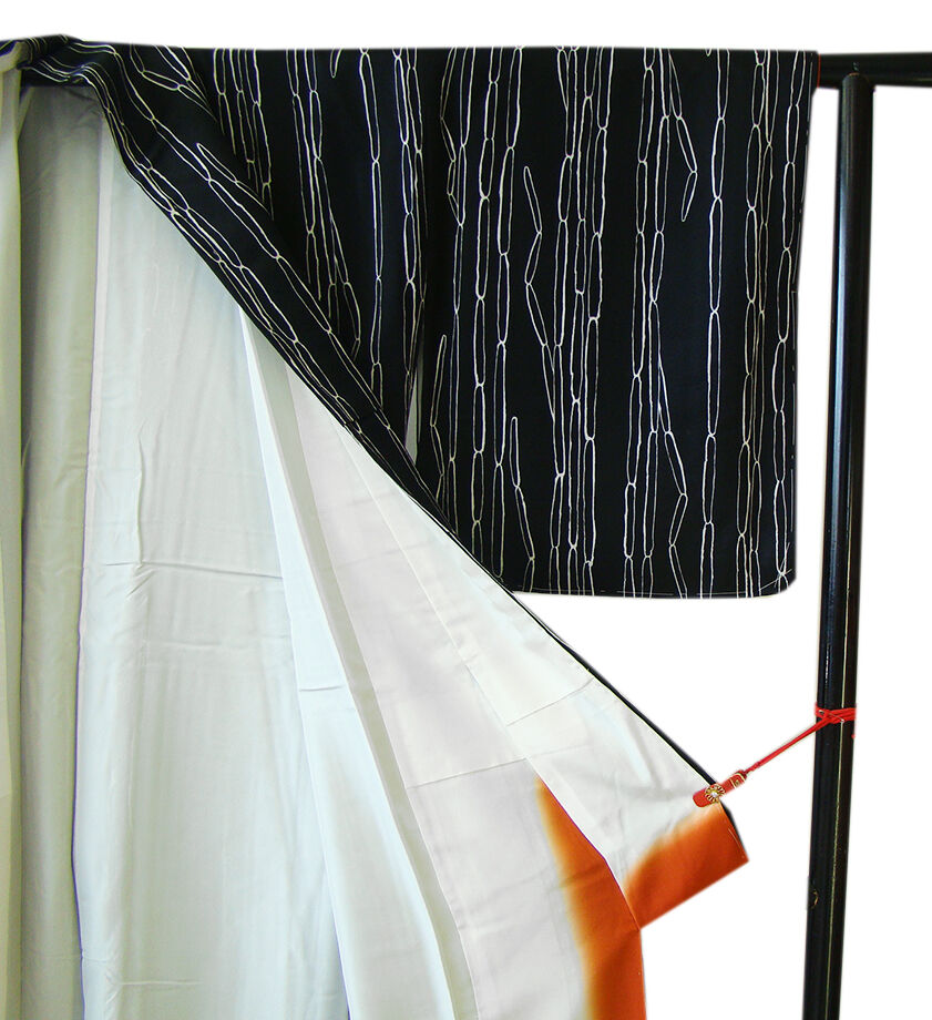 商品説明 | こちらのお品は「袷」ですので10月から5月までお召頂ければと思います。 しなやかなぽってりふっくらとした手触りの着心地良い重めの極上ちりめん地の生地、 黒色地に白色の染柄、 八掛は樺色(正絹)、幅広い年代の方にお召頂けます。 |