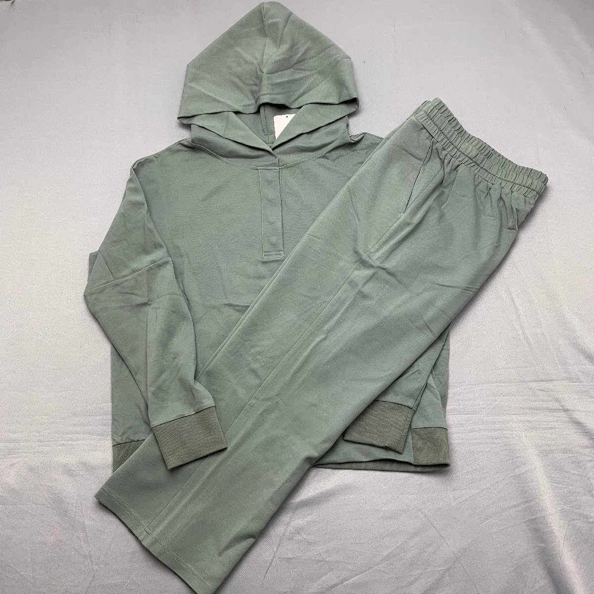 パーカートレーナー<カットソー>とワイドパンツがセットアップされたスーツです。