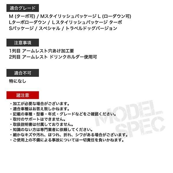 | 注意事項 | 1列目 アームレスト穴あけ加工要 2列目 アームレスト ドリンクホルダー使用可 |