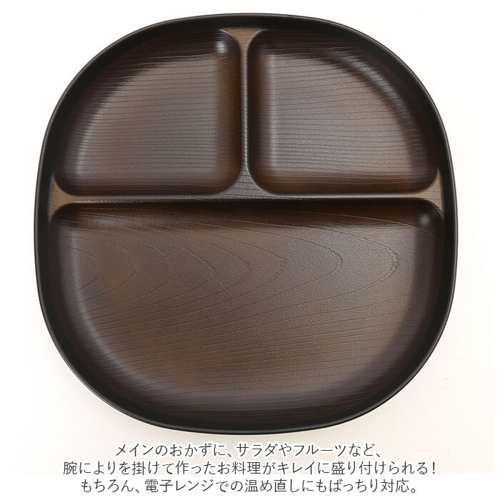| 商品説明 | ・・軽くて割れにくい「MUSUBI」食器シリーズに、「塗分けランチプレート」が仲間入り。 ・メインのおかずに、サラダやフルーツなど、腕によりを掛けて作ったお料理がキレイに盛り付けられる!シンプルなランチプレート。 ・3つに分かれた仕切りには程よく深さがあり、カレーのような汁気のおかずやハンバーグにかかったソースも混ざらず、カフェようなオシャレなランチを手軽に実現! ・仕切りの角は滑らかなカーブに仕上げ、小さなお子さまでもスプーンで簡単に掬い上げられる優しいフォルムにデザイン。 ・もちろん、電子レンジでの温め直しにもばっちり対応。 ・食器洗浄機で手軽にお手入れが可能。ワンプレートだから、洗い物の手間が少なく済むのも嬉しいポイント! ・プレート表面は木目調に仕上げたナチュラルウッドとダークブラウンウッドの2タイプ。縁取りの鮮やかなカラーがPOPなデザインのアクセントに。 ・縁取り部分にはわずかな段差を設けてあり、カチッと重ねてスタッキング収納ができるように設計。食器棚でも場所を取らずに省スペース♪ ・表面の塗装は、丈夫で長持ちする樹脂製の素地に、石川県加賀市・山中温泉地区に伝わる塗装技法「山中塗り(やまなかぬり)」を施したもの。 ・「MUSUBI」シリーズは、ひとつひとつ手作業で仕上げたつくり手の「こころ」と、使う人の「こころ」とをひとつに「結びつなぐ」ことを願って生まれた食器シリーズ。安心の日本製品。 |