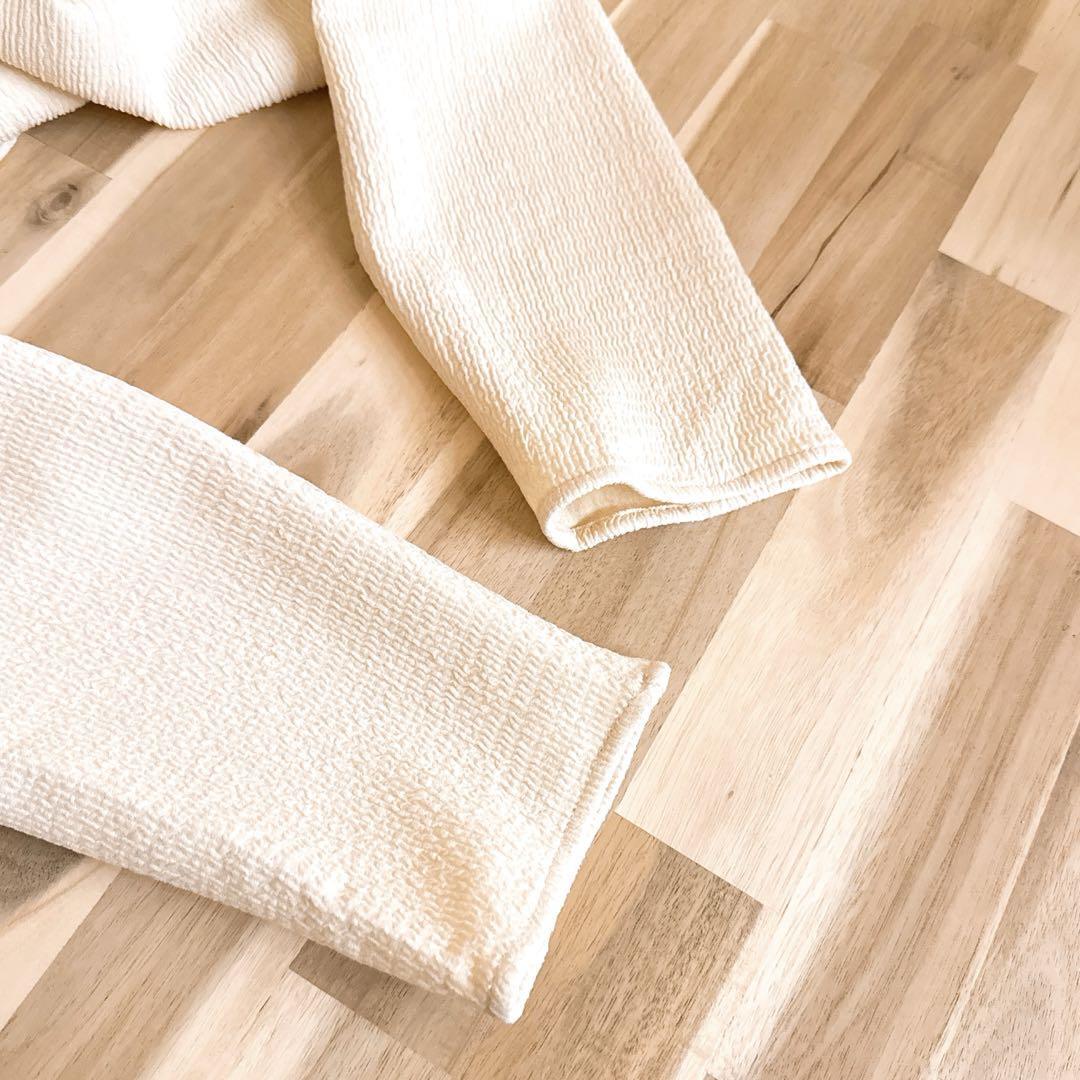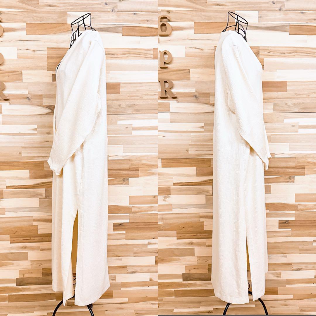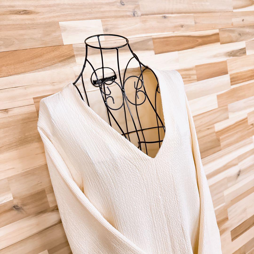 しぼ加工(凹凸)が施されたやや薄手の素材で、柔らかな風合いと軽やかな肌ざわりが魅力。まろやかなアイボリーをベースに、深めのVネックが首元をすっきりと見せてくれる。サイドスリットが抜け感を添え、レイヤードコーデにも映えるデザイン。リラックス感あるボトムスやサンダルと合わせて、肩の力を抜いた上品なスタイルにもおすすめなZARAのワンピースです。※LGスタイラーにて除菌リフレッシュ・スチームクリーニング済みです。