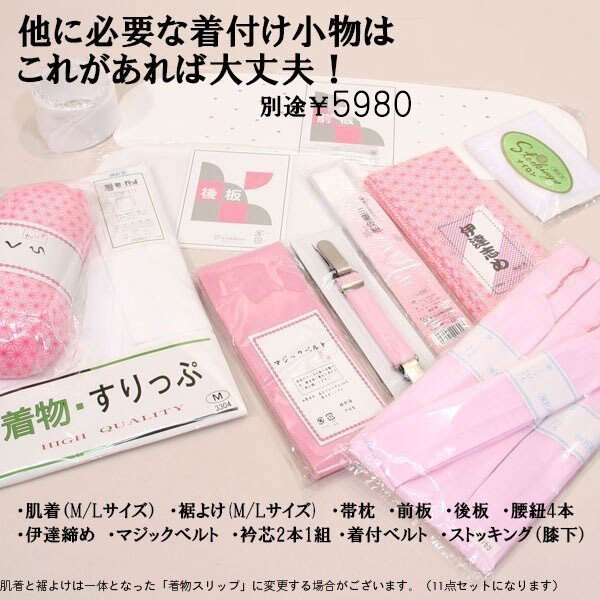| 着付け小物セット | ★着付け小物セットMサイズ/Lサイズを別途\5980でご用意できます。 ※肌着(着物スリップ)参考サイズ M:身丈120cm 身巾52cm 繰越10cm 裾廻130cm L:身丈120cm 身巾60cm 繰越10cm 裾廻140cm ※ご要望のお客様は、「フォーム備考欄」「メール(aji_net@khaki.plala.or.jp)」「お電話」「FAX」いずれかの方法でご連絡ください。 |
