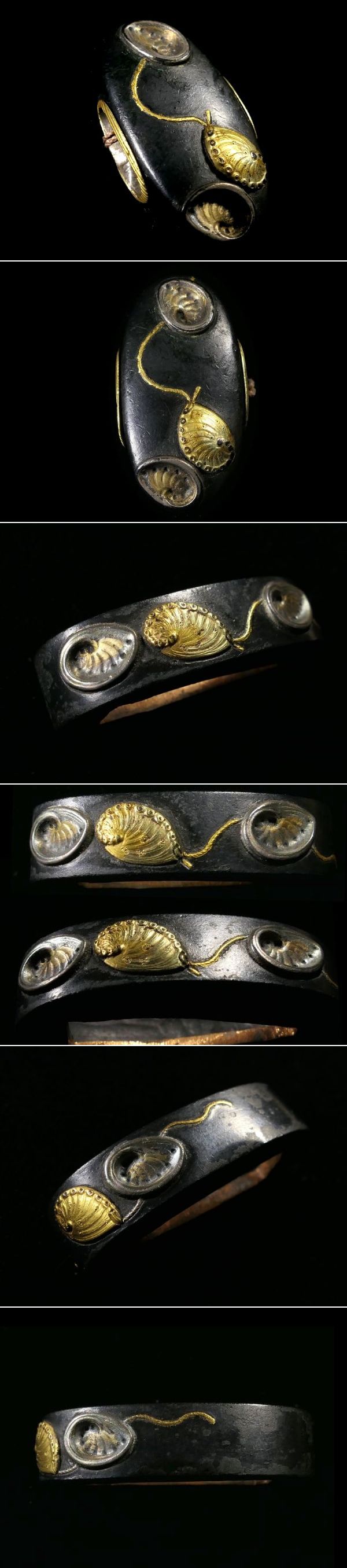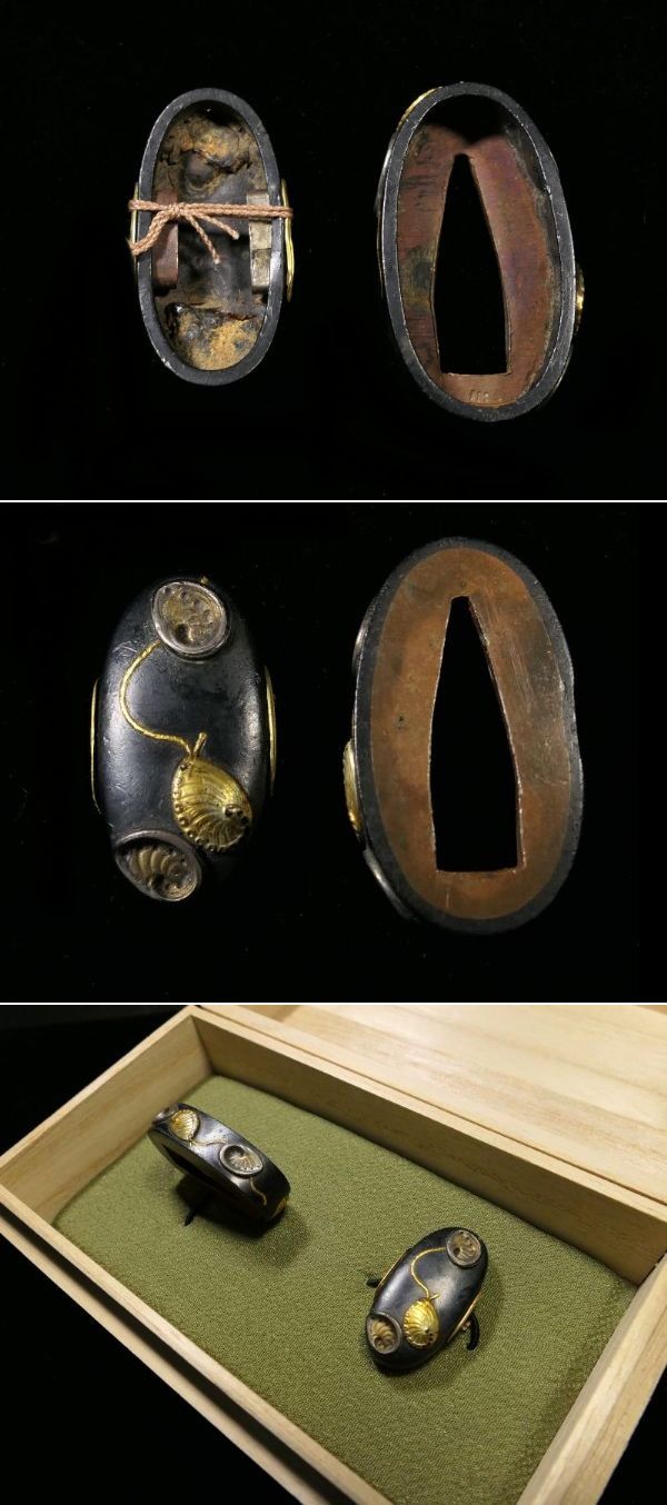 | 商品説明 | 上質な赤銅地に 金銀鮮やかな貝散図の施された 見栄え良き一品です。 作行から見て 後藤系統の優品と推測しております。 詳しくは画像にてご確認下さい。 お好きな方、 この機会に是非手に入れて下さい。 【上質な赤銅地】 【見栄え良き金銀象嵌色絵】 【拵栄えする一品】 寸法: (縁) 約 3.81cm × 約 2.12cm × 約 0.96cm (厚み) (頭) 約 3.46cm × 約 1.71cm × 約 0.70cm (厚み) 時代: 江戸時代 材質: 赤銅地 桐箱付 銘 : 無銘 状態:特に気になる傷みはなく良好。画像にてご判断下さい。 :許容範囲内の時代傷みはご理解下さい。 |