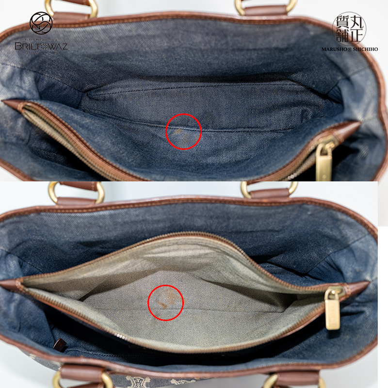 | ・デニム生地にやや色褪せあり ・レザーに薄く細かな擦れあり ・パイピングのレザーに薄い色剥げあり ・内部ファスナーポケットの底辺りに 色染みあり(同じ箇所の表面と裏面) |