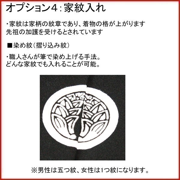| 紋入れ | ■家紋は別途¥6600にて入れることができます。 家紋名をお知らせください。 6~8日間ほどお時間をいただきます。 ※染め紋(摺り込み紋):五つ紋になります。 ※ご要望のお客様は、「フォーム備考欄」「メール(aji_net@khaki.plala.or.jp)」「お電話」「FAX」いずれかの方法で『家紋の種類』をご連絡ください (家紋名が分からない場合は、家紋の画像を添付ファイル又はFAXでお送りください。 こちらでお調べ致します。) ※ご要望のお客様は、※ご要望のお客様は、「フォーム備考欄」「メール(aji_net@khaki.plala.or.jp)」「お電話」「FAX」いずれかの方法でご連絡ください。 |