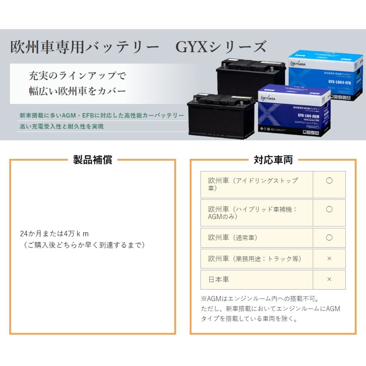 | 装着可否 | 欧州車(アイドリングストップ車):○ 欧州車(ハイブリッド車補機:AGMのみ):○ ※AGMはエンジンルーム内への搭載不可。ただし、新車搭載においてエンジンルームにAGMタイプを搭載している車両を除く。 欧州車(通常車):○ 欧州車(業務用途:トラック等):× 日本車:× |