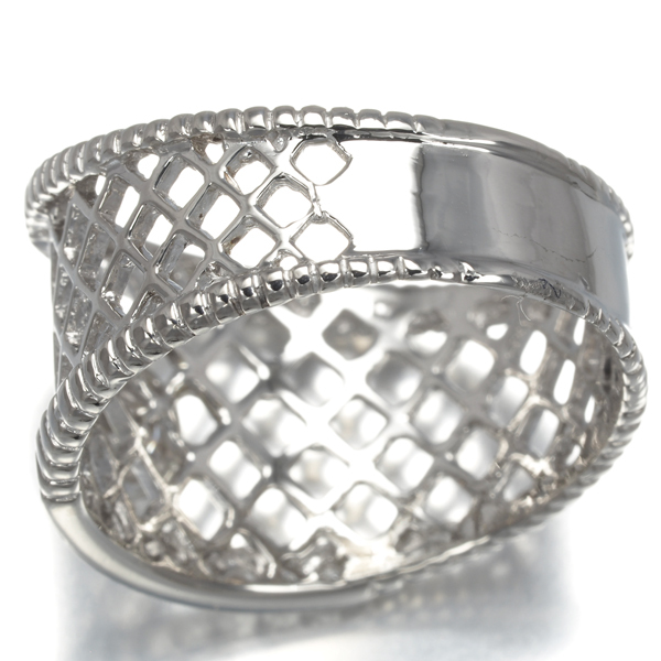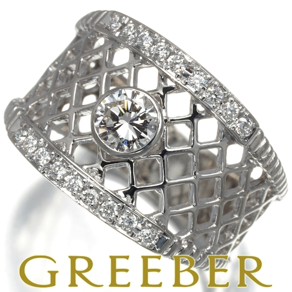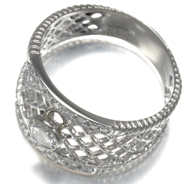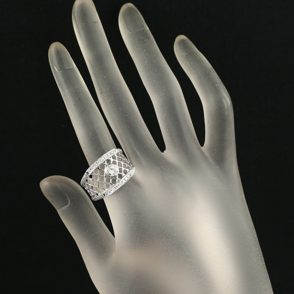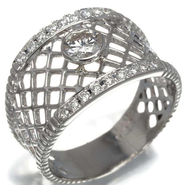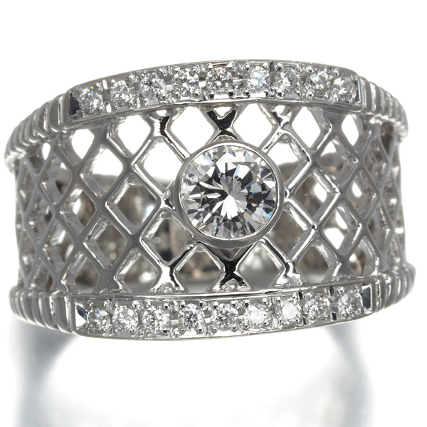 仄かに色味がございますが、VSクラスアップと思われる素晴らしい透明感を持つ大粒ダイヤモンドを中央に添えたリング。両端にはメレダイヤを並べたボリュームある幅のなかで格子状の透かしを演出した優雅な雰囲気と共に瑞々しい輝き溢れるジュエリーです。 |