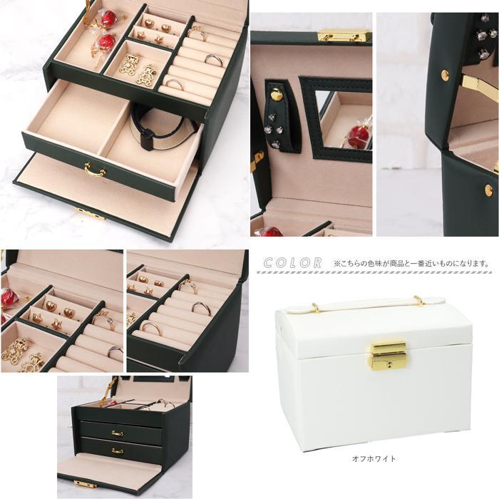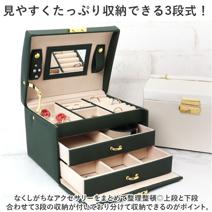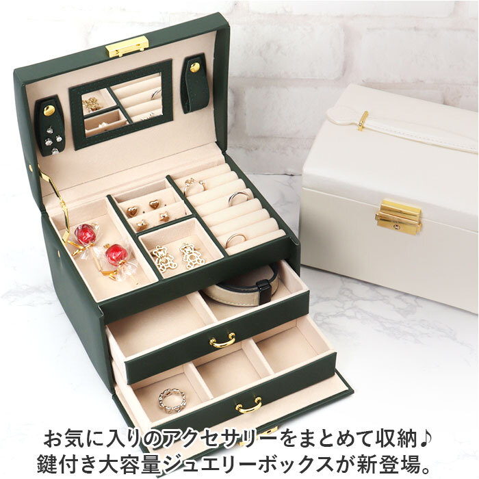 | 商品説明 | ・・お気に入りのアクセサリーをまとめて収納♪鍵付き大容量ジュエリーボックスが新登場。 ・【見やすくたっぷり収納できる3段式!】 ・なくしがちなアクセサリーをまとめて整理整頓◎上段と下段合わせて3段の収納が付いており分けて収納できるのがポイント。 ・【上段】 ・よく使うアクセサリーの収納に便利!リングスロット×8とピアス穴×16、大小1ずつのトレー付き。 ・大のトレーは縦に長く、腕時計の収納に便利◎ ・【鏡付き】 ・天面裏の中央には鏡が付いており、ピアスやネックレスの着脱時もスムーズに。 ・【下段】 ・・2つの引き出しが付いており、上の引き出しにはブレスレットやバングル、下の引き出しにはブローチや大きな石が付いたリングの収納にピッタリ♪ ・【仕切りの取り外しが可能】 ・上段のピアス穴付き仕切りと、下の引き出しの仕切りは取り外しが可能。収納するアクセサリーに合わせてカスタマイズが可能。 ・【傷付きを防止】 ・内張りと仕切りはベロア調の生地を使用し、アクセサリーを優しく保護。 ・【ワンタッチ開閉】 ・開口金具の両サイドを内側に押してオープン!戻す時は、カチッと鳴るまでフタを閉じるだけ。 ・【鍵付きで安心】 ・大切なアクセサリーを保管するのに最適◎ ・【出しっぱなしでもOK】 ・程よい光沢感とゴールドパーツが上品な仕上がり♪インテリアに溶け込み、出しっぱなしでもOK。 |