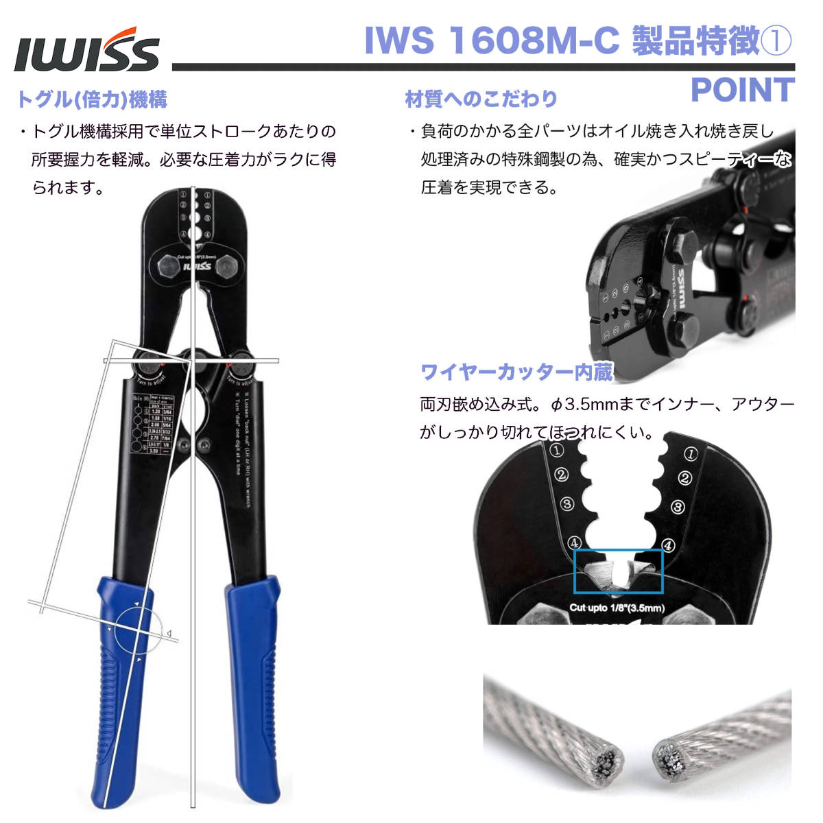 ★ワイヤーロープカッター機能装備 アルミスリーブ かしめ機 圧着 切断 1丁2役!φ1.2mm-φ3.5mm圧着 IWS-1608M-C★ | |||
