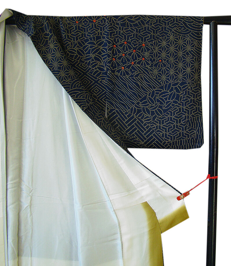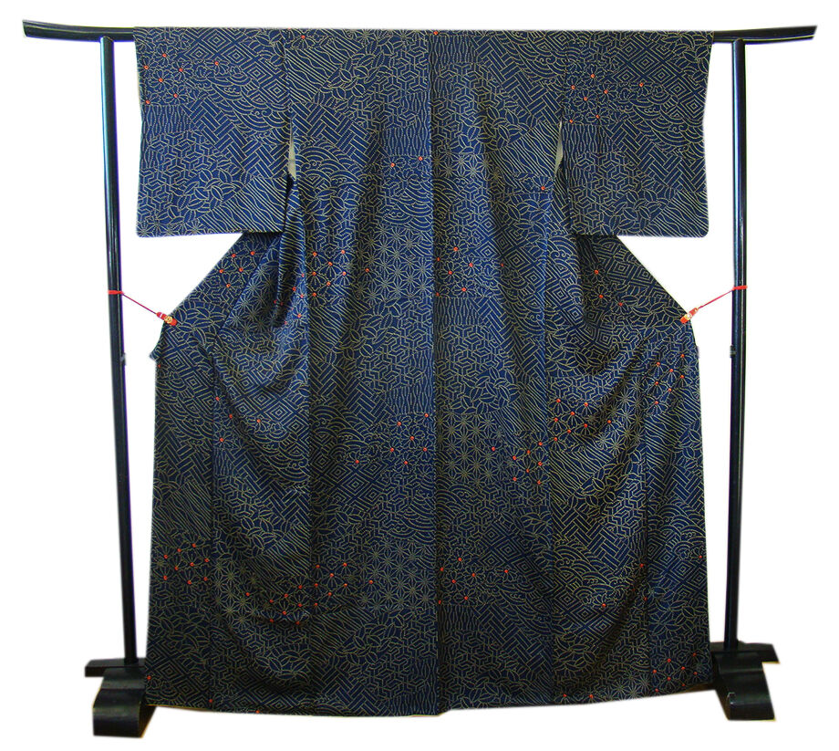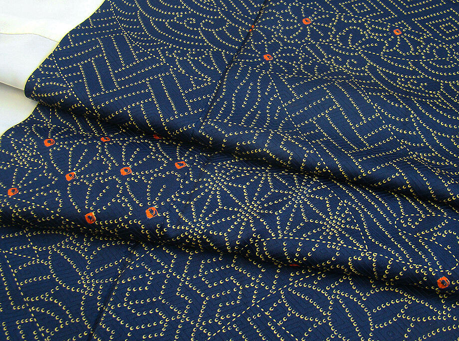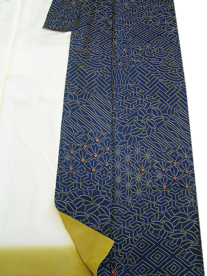 | 商品説明 | こちらのお品は「袷」ですので10月から5月までお召頂ければと思います。 とてもしなやかなさらりとした手触りの着心地良い重めの紋意匠地の生地、 濃紺色地に地模様入りに、からし、赤色の花や麻の葉、菱、よろけ縞等の染柄、 八掛は桑染色(正絹)、幅広い年代の方にお召頂けます。 |