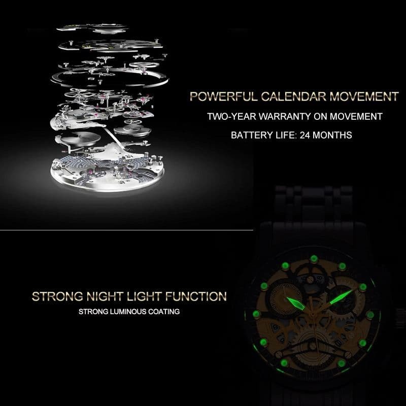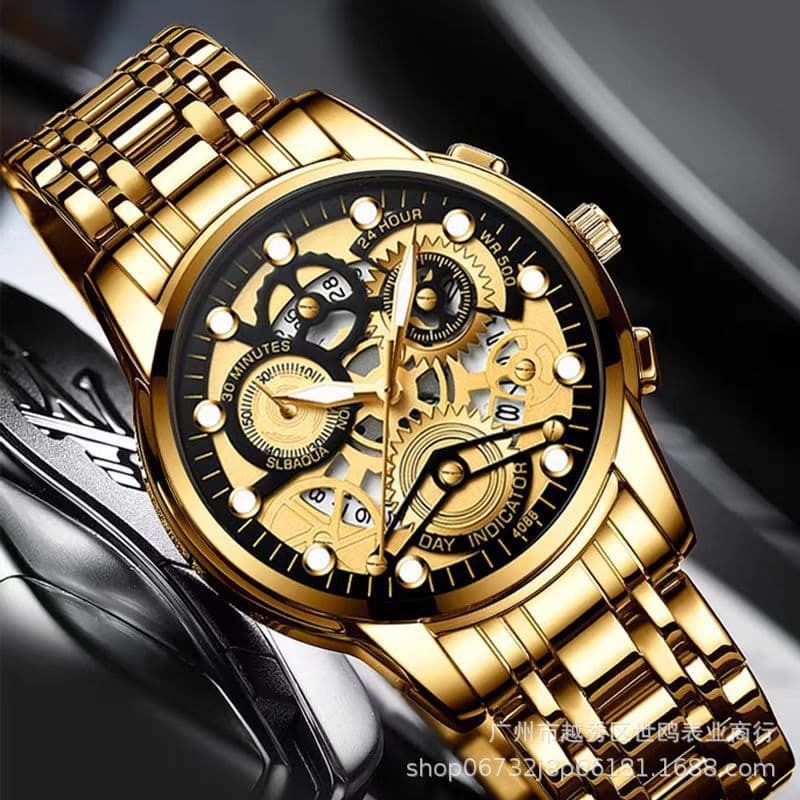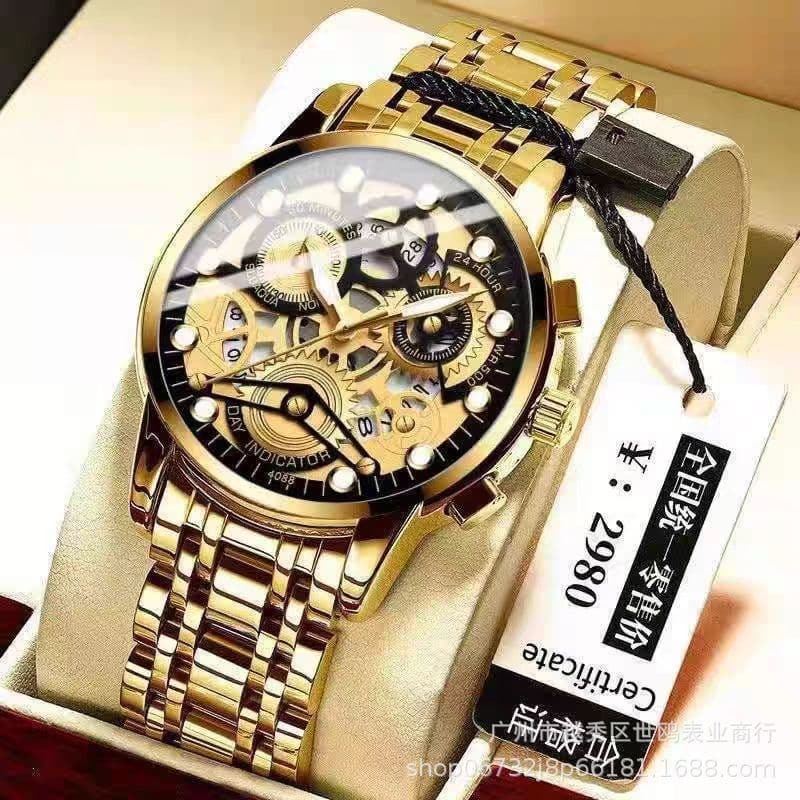 高級感あふれるゴールドカラーのメンズ腕時計。 スケルトンデザインで内部の機構が見える美しい仕様。 ビジネスシーンやフォーマルにも映える1本です。 ステンレス素材のベルトは重厚な印象を演出。 防水性能30M、クォーツムーブメント(SL68)搭載で実用性も兼備。 ミネラル強化ガラスミラー採用で傷に強く、41mmの文字盤で視認性も抜群。 新品・未使用品のためギフトにもおすすめ。スタイリッシュな大人の腕元にぜひ。 サイズ 文字盤直径:41mm 厚さ:11mm バンド素材:ステンレス鋼 バンドカラー:ゴールド ブラック コンディション(新品) 未使用の新品です。 動作確認済み。 外箱・付属品はつきません。 初期不良があれば対応いたします。