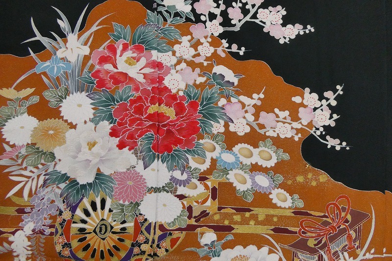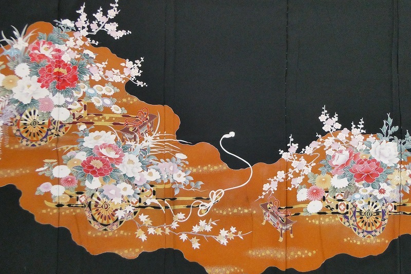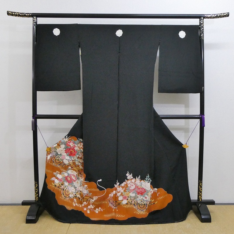 ◆黒留袖/濱ちりめん/花車/新品/未仕立て/正絹/絵羽/(梱包サイズ:80)◆* コメント・全体的に薄汚れ・薄い色ヤケがあります。 ・新品ですが、経年保存されていたお品ですので、ご理解のある方のご入札をお願い致します。 ・絵羽(仮縫い状態)ですので、着用にはお仕立てが必要です。当店でもお仕立てを受け賜わっております。お仕立代はこちらを参照してください⇒http://marubun.stars.ne.jp/sitate.jpg また、ご不明な点(納期等)はご落札前に質問をして下さい。宜しくお願い致します。 ・ ・ * 品質・サイズ -- 着物サイズ目安 -- ・身丈・約169cm、袖丈・約58cm、裄・約69cm ・五つ紋:石持ち ・ ・※一部商品のみのお取引はお断り致しております。入札前・落札後に一部の商品のみのお取引交渉や発送方法(メール便等利用)の交渉はご遠慮下さい。サイズ・発送詳細を必ずご確認のうえ、ご理解・ご納得のうえでのご入札をお願い致します。 ・梱包サイズ:80サイズ(発送詳細必読) * 程度 当社基準ランク・・・【4】