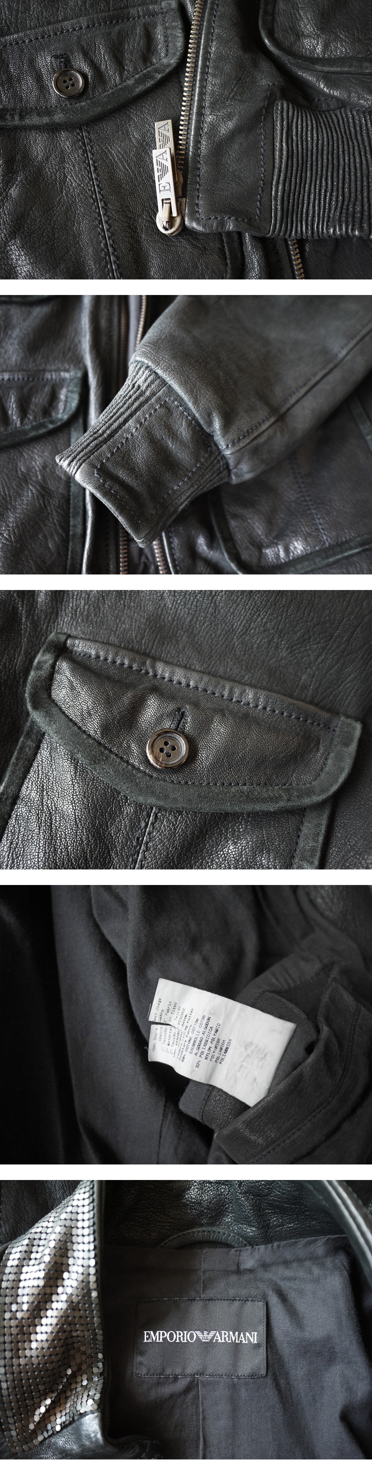 エンポリオアルマーニのリアルゴートレザーブルゾンでございます。ランウェイにも採用されたモデルで、イタリアトップメゾンの名に恥じない高い製法技術により仕立てられた優雅で存在感のあるプロポーションで、大変ラグジュアリな逸品でございます。
